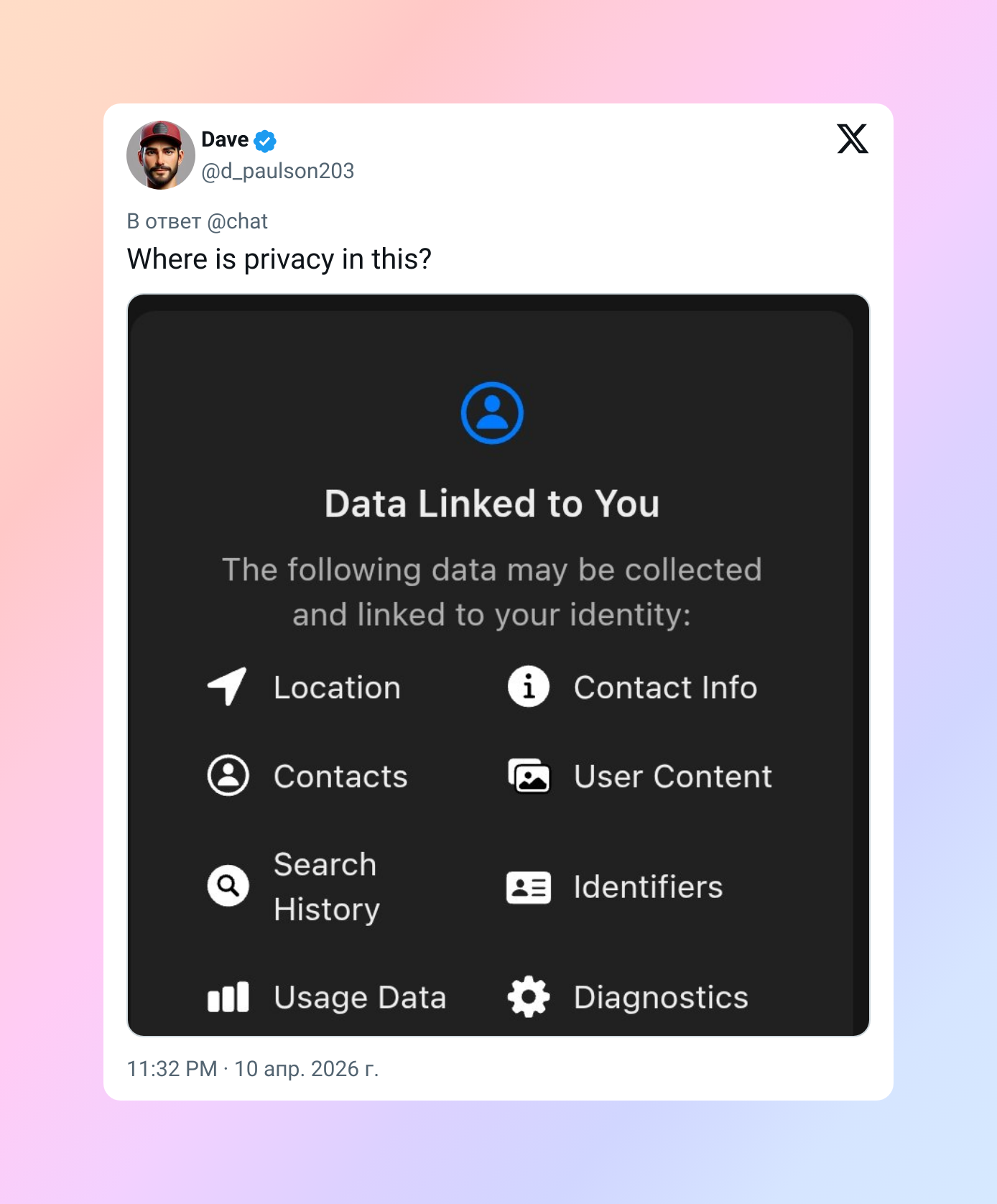 Разработчики обещают, что для регистрации не потребуется номер телефона, а само приложение не будет содержать рекламы и заниматься отслеживанием данных. Однако внимательные пользователи уже заметили, что в карточке конфиденциальности в App Store указан сбор геолокации, истории поиска и контактных данных. Так что обещания о «нулевой слежке» пока выглядят несколько противоречиво.