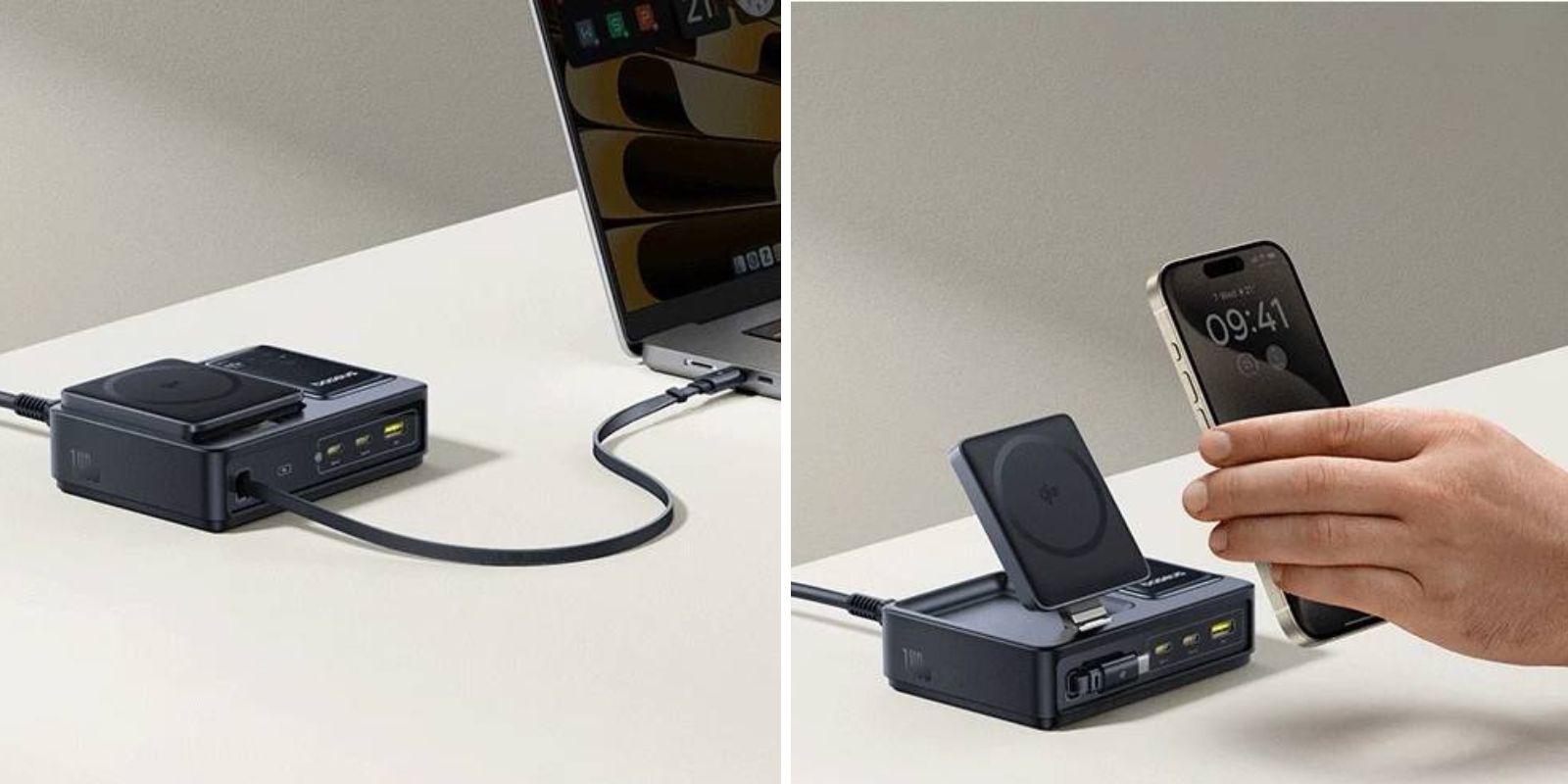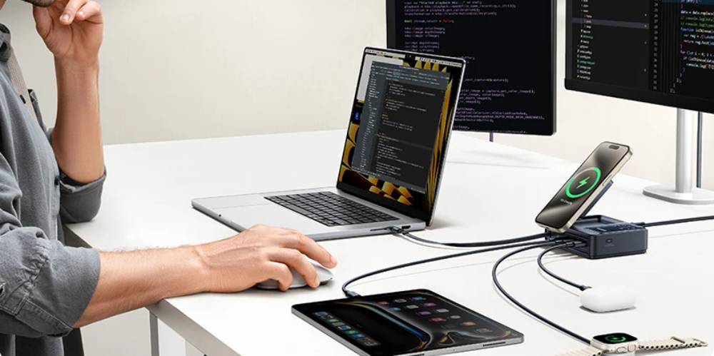 Настольная станция Baseus Nomos помогает поддерживать порядок на рабочем столе: она избавляет от кучи зарядных устройств и кабелей, потому что подходит для одновременной подпитки пяти гаджетов, включая энергоёмкие ноутбуки.