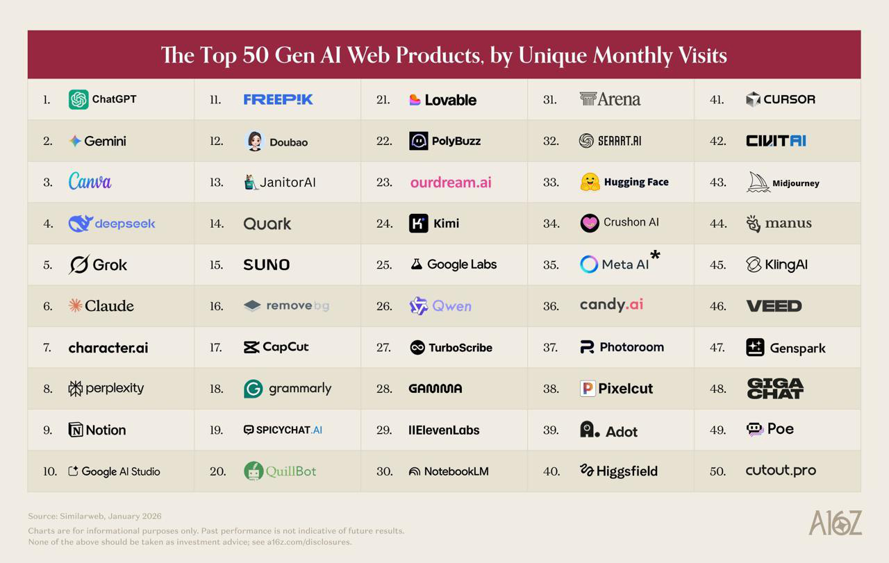 Инвестиционная компания Andreessen Horowitz шестое издание своего рейтинга «100 лучших сервисов с искусственным интеллектом». В этот раз аналитики расширили охват, включив CapCut, Canva и другие продукты, которые не являются чат-ботами, но уже активно используют ИИ. Однако даже при возросшей конкуренции ChatGPT сохранил лидерство.