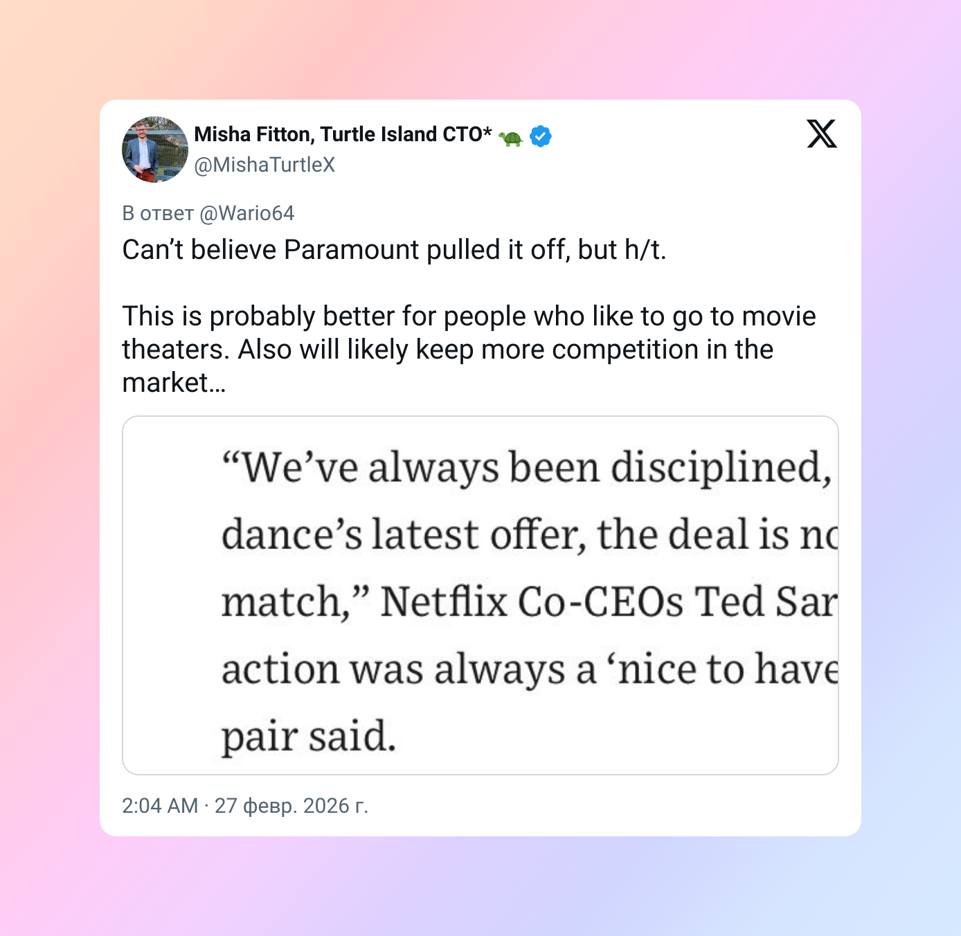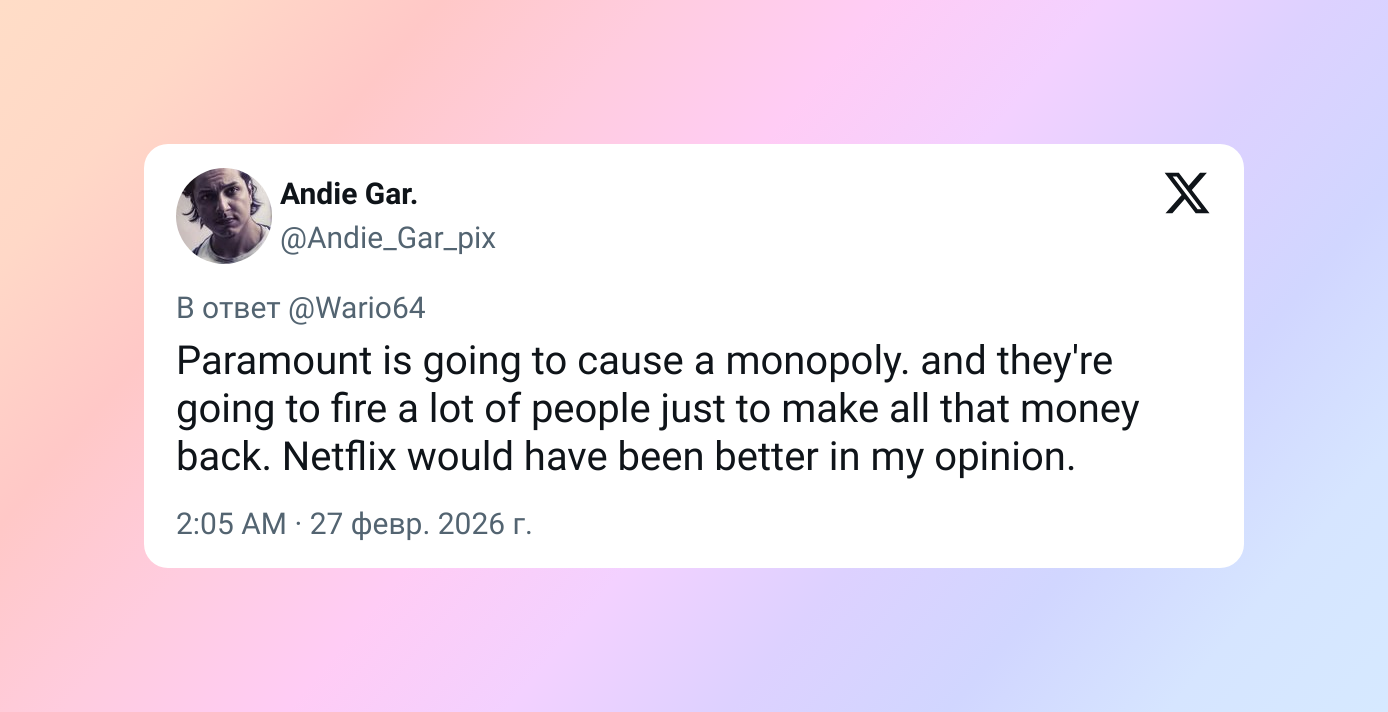Paramount в итоге устроит монополию. И чтобы отбить все эти деньги, они наверняка уволят кучу людей. На мой взгляд, с Netflix всё было бы лучше.