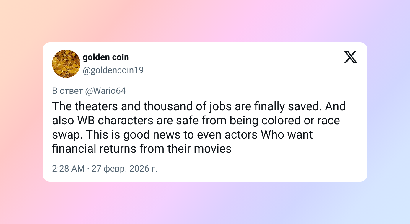 Кинотеатры и тысячи рабочих мест наконец-то спасены. И персонажи Warner Bros. тоже в безопасности — без перекрашиваний и смены расы. Это хорошая новость и для актёров, которые рассчитывают на финансовую отдачу от своих фильмов.