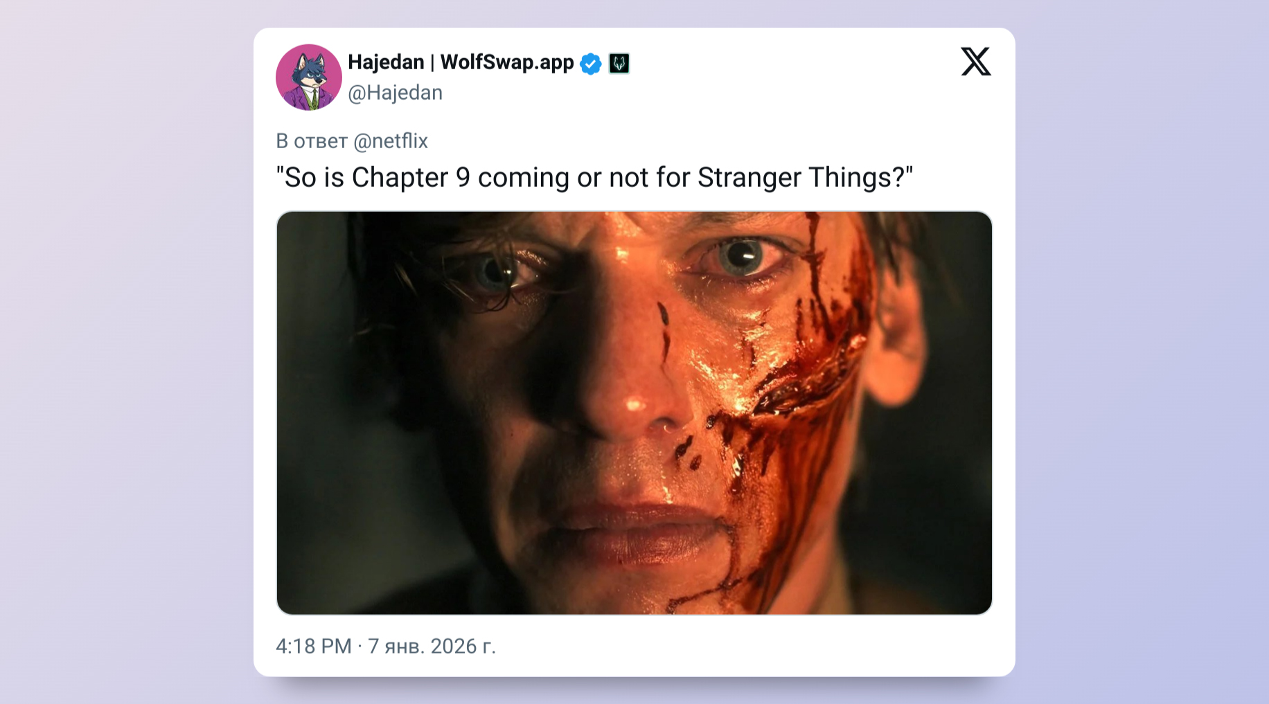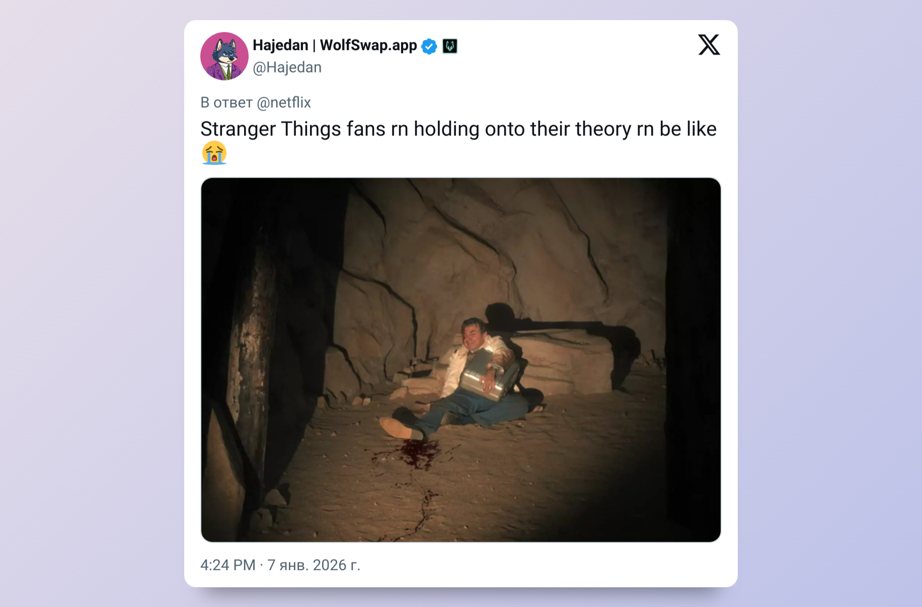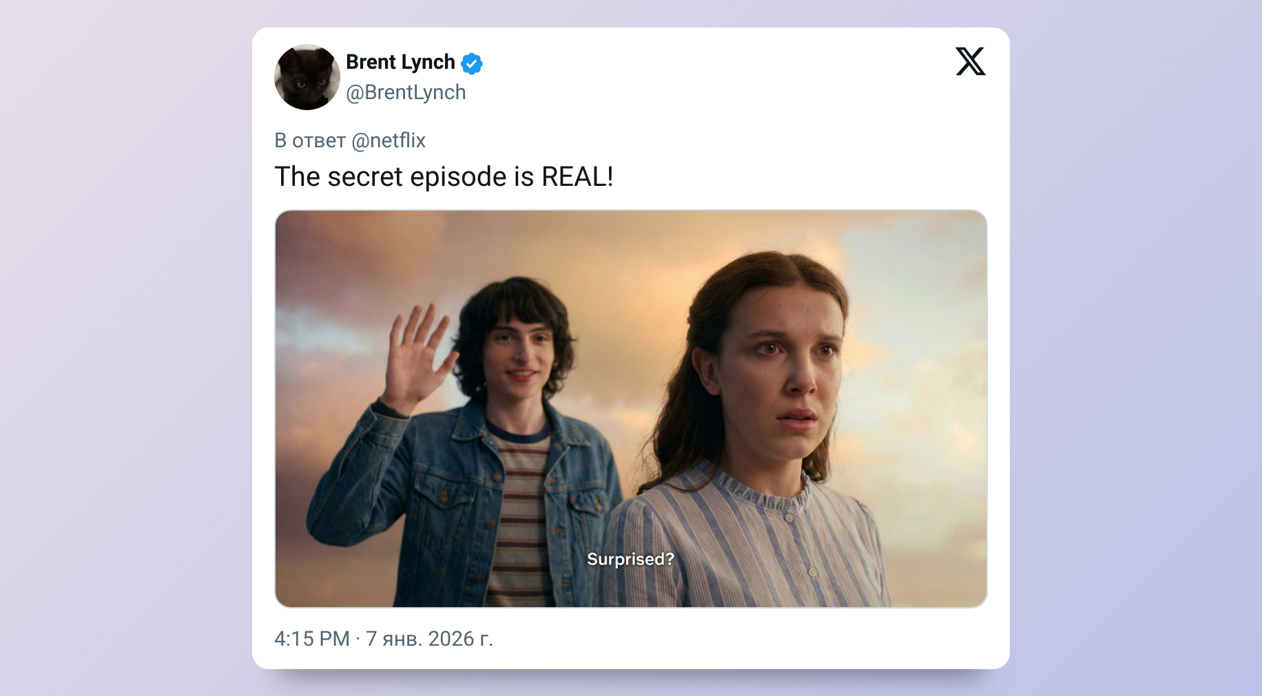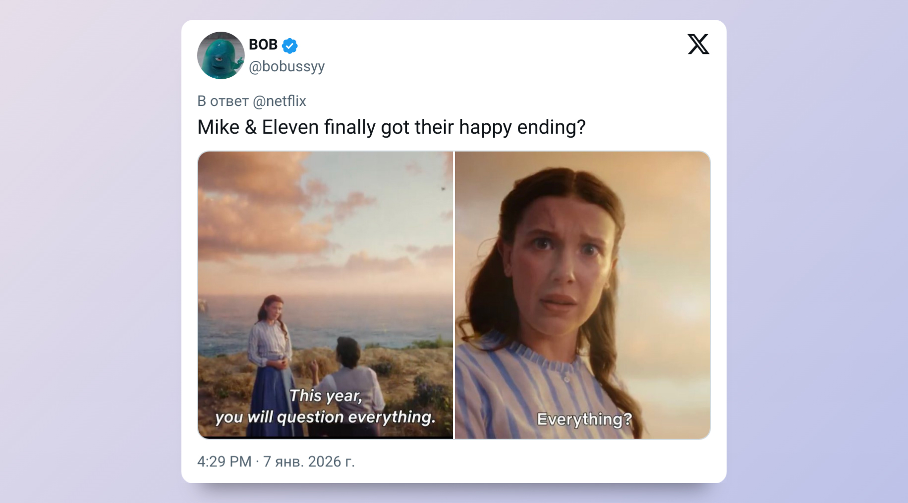 В комментариях под ролика в соцсети X сразу же активизировались фанаты «Очень странных дел», которые ждут секретный эпизод финального сезона сериала. Кадр с Милли Бобби Браун из «Энолы Холмс — 3» стал новой «зацепкой» и поводом для фотожаб.