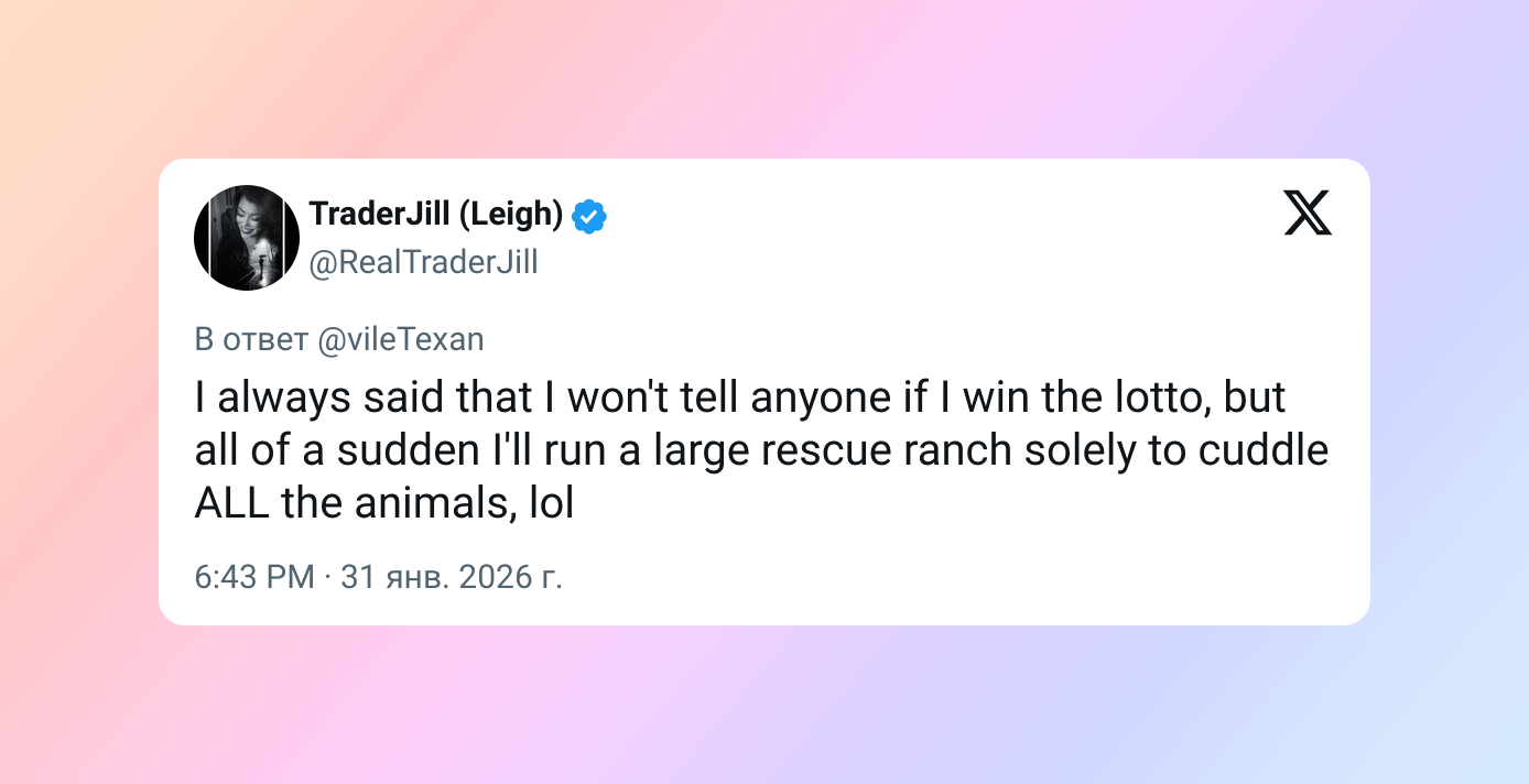 Я всегда говорила, что никому не скажу, если выиграю в лотерею, но внезапно открою большой приют-ранчо, где можно будет просто обнимать ВСЕХ животных, ха-ха.