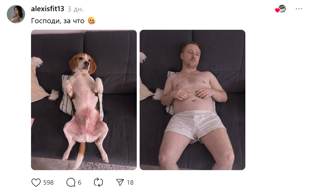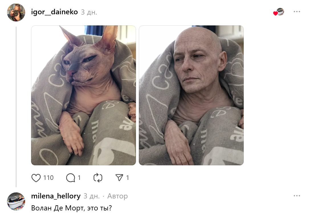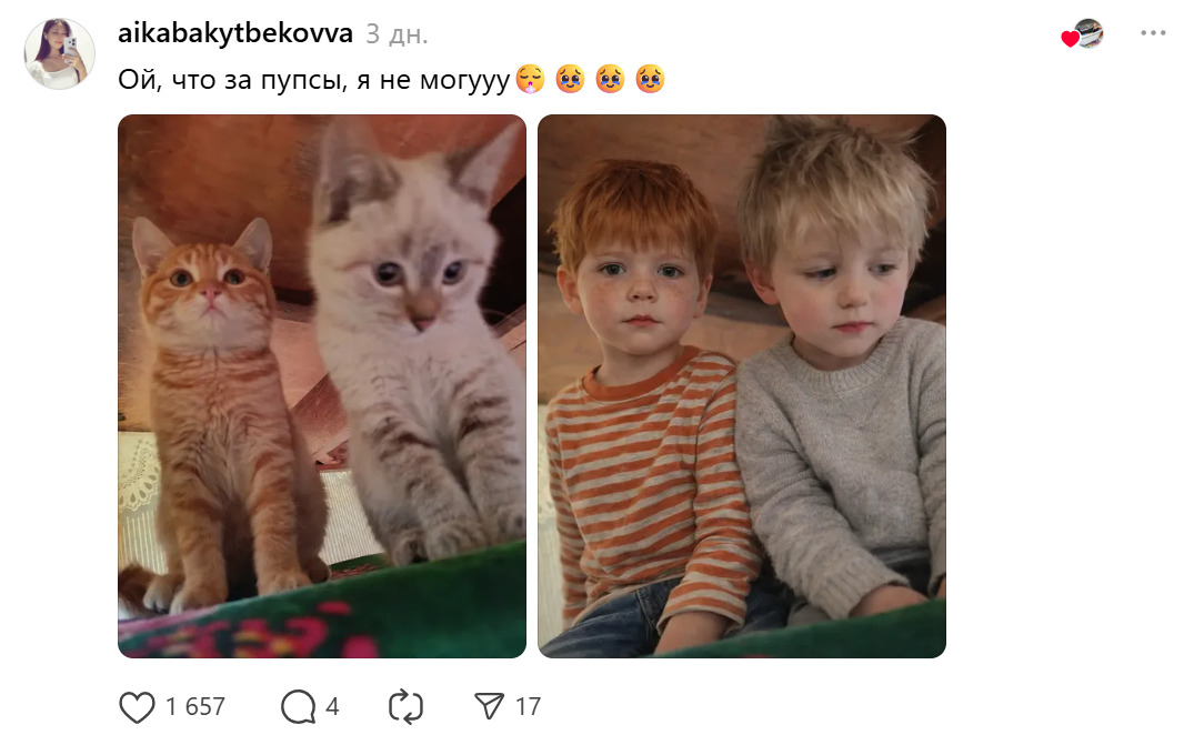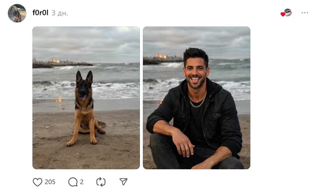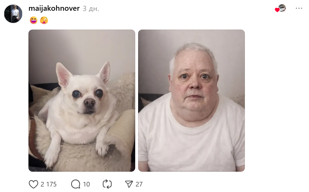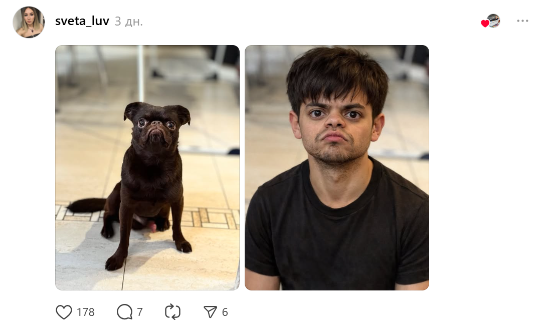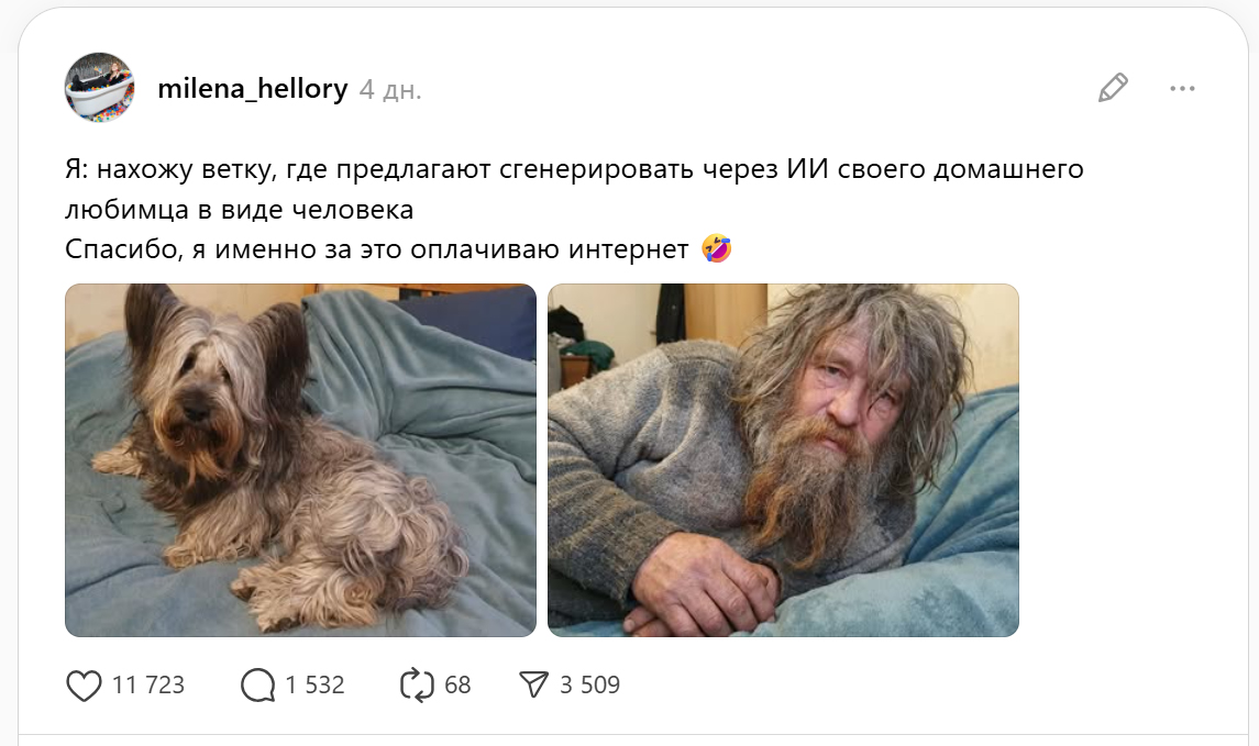 В соцсети Threads завирусился новый тред с превращением домашних питомцев в людей при помощи ИИ. Одна публикация пользователя @milena_hellory разрослась уже более чем на 1 500 комментариев за несколько дней.