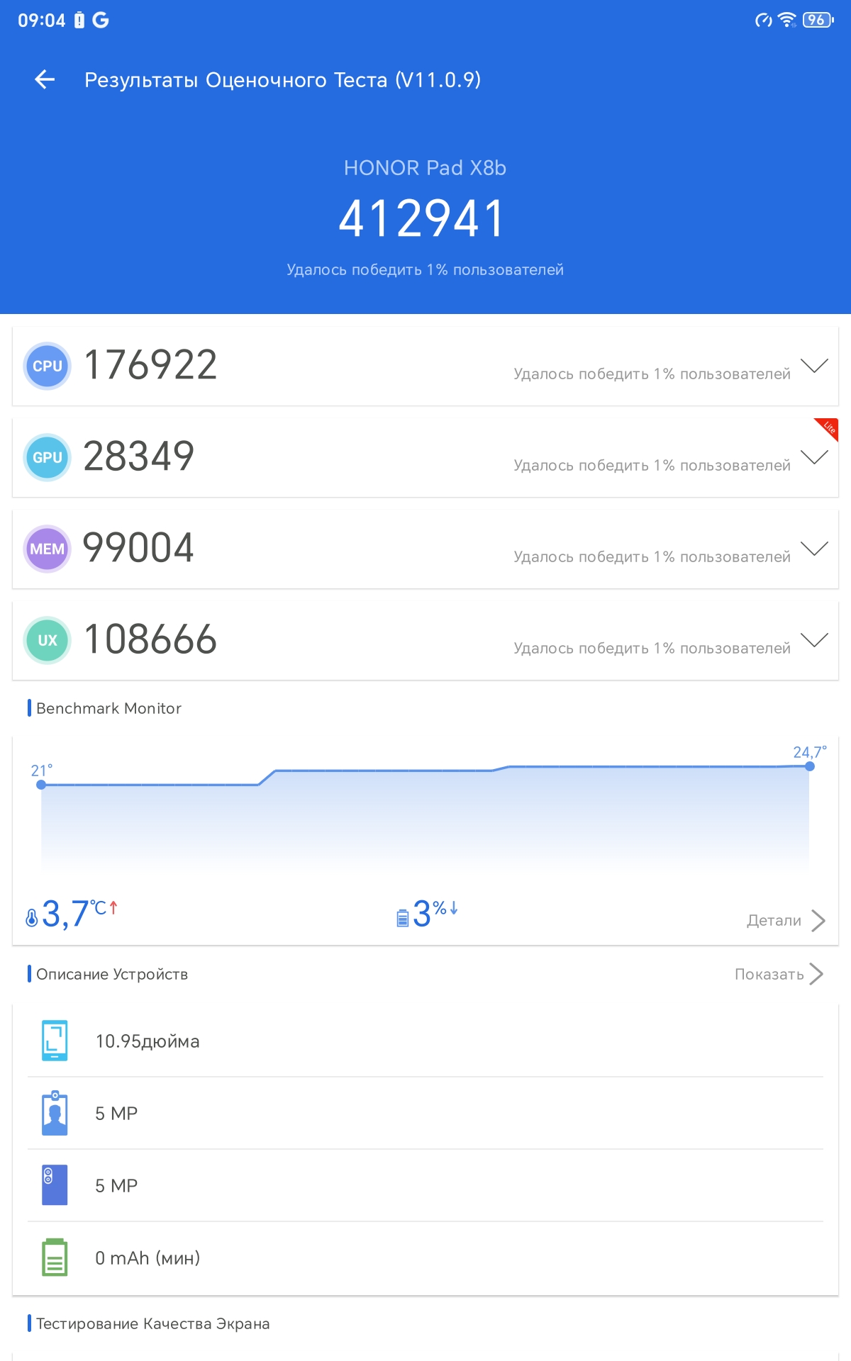 Honor явно знакома какая-то чёрная магия, потому что у каждого следующего планшета, который приезжает на тест, с автономностью становится всё только лучше. Honor Pad X8b — апогей этого тренда: его батареи на 10 100 мА·ч спокойно хватит на неделю, если использовать планшет для часа-другого видео и игр по вечерам. Разрядить этого монстра просто физически тяжело. Производитель обещает до 22 часов работы при просмотре видео онлайн и аж до 97 дней в режиме ожидания, и в это охотно верится.