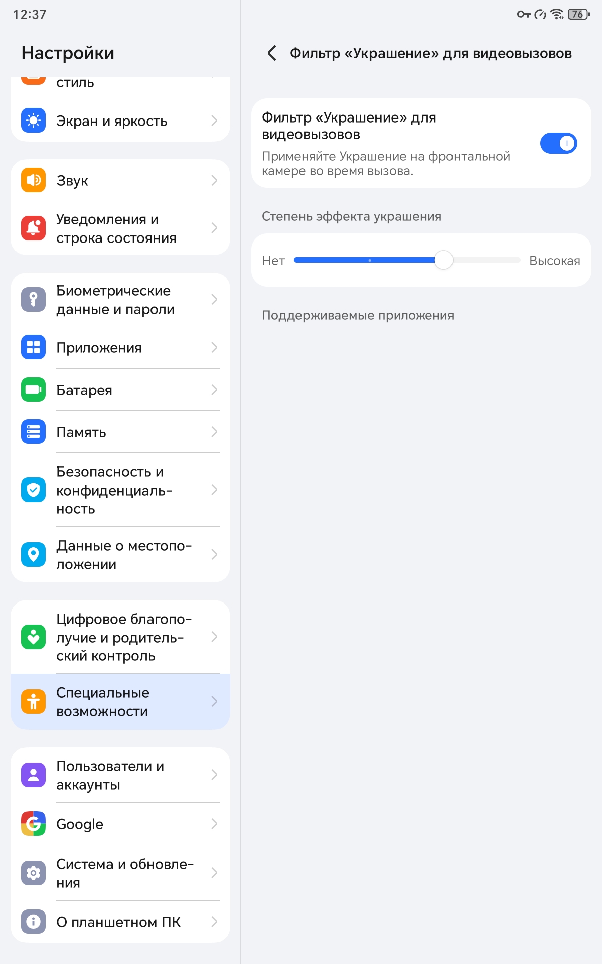 Из других необязательных параметров порадовала регулировка украшения при видеозвонках: можно один раз выбрать, хочется сглаживания кожи или нет, и не искать эту настройку внутри собственно сервисов для звонков.