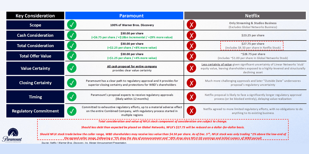 Предложение Paramount за всю WBD даёт акционерам на 18 миллиардов долларов больше наличными, чем вариант Netflix. Рекомендация совета директоров WBD в пользу сделки с Netflix вместо предложения Paramount основана на иллюзорной перспективной оценке подразделения Global Networks, которая не подтверждается реальными показателями бизнеса и осложняется высоким уровнем долговой нагрузки, возложенной на это подразделение.