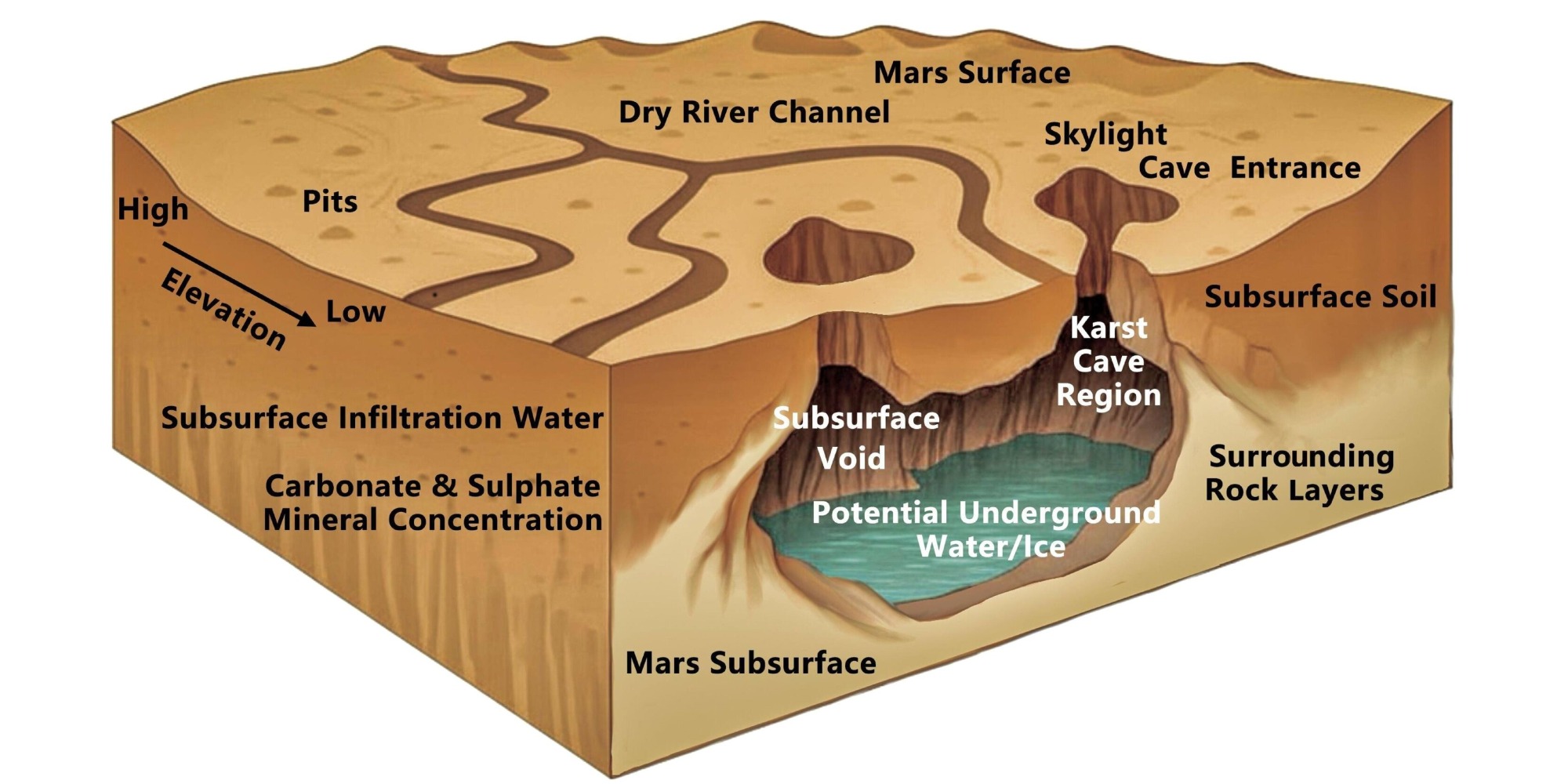 Анализ данных спектрометра TES с аппарата NASA Mars Global Surveyor показал, что окружающие породы богаты карбонатами и сульфатами — минералами, легко растворимыми в жидкости. По мнению авторов работы, именно древняя марсианская вода могла постепенно размывать эти породы, создавая пустоты и провалы.