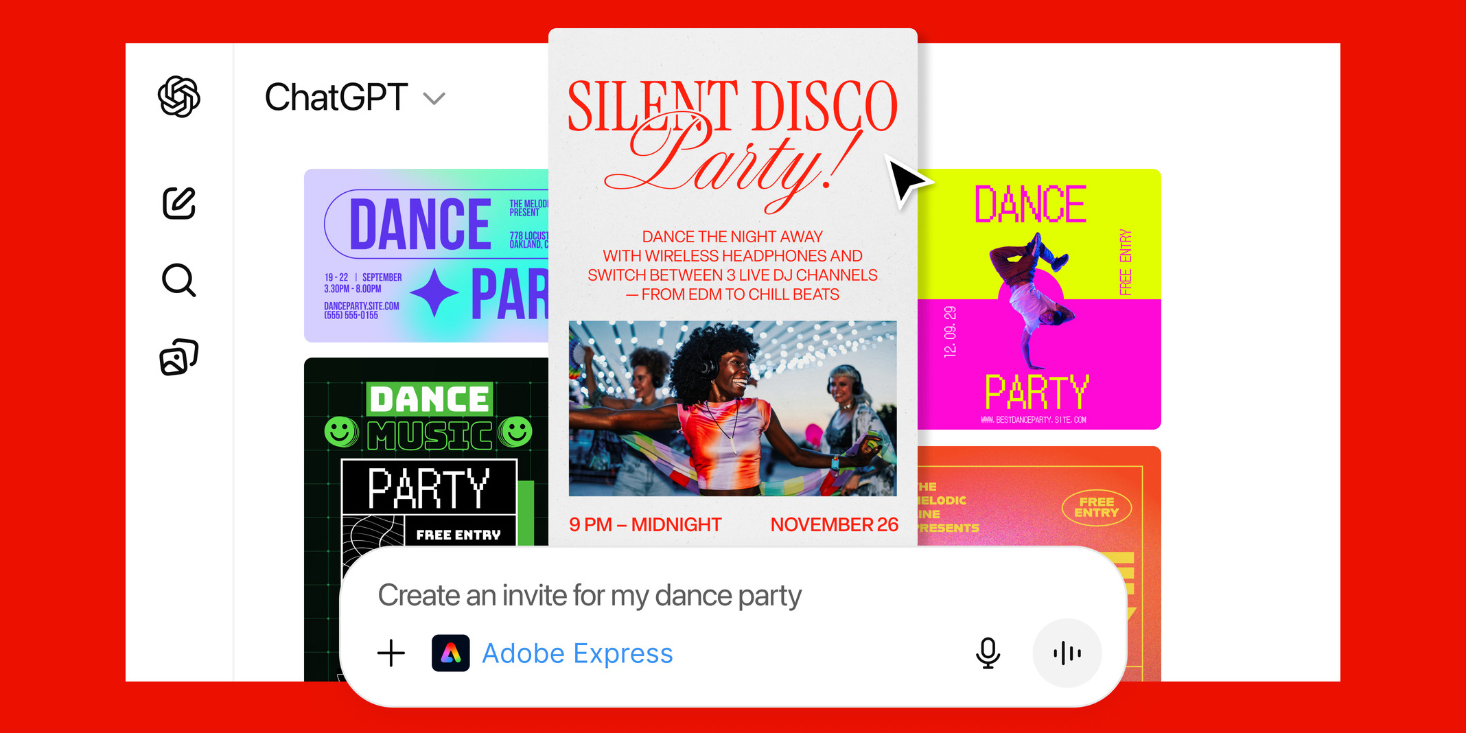Через интеграцию с Express можно создавать и редактировать макеты для постеров, открыток и постов в соцсетях. Есть возможность менять текст, изображения, цвета и даже анимировать элементы.