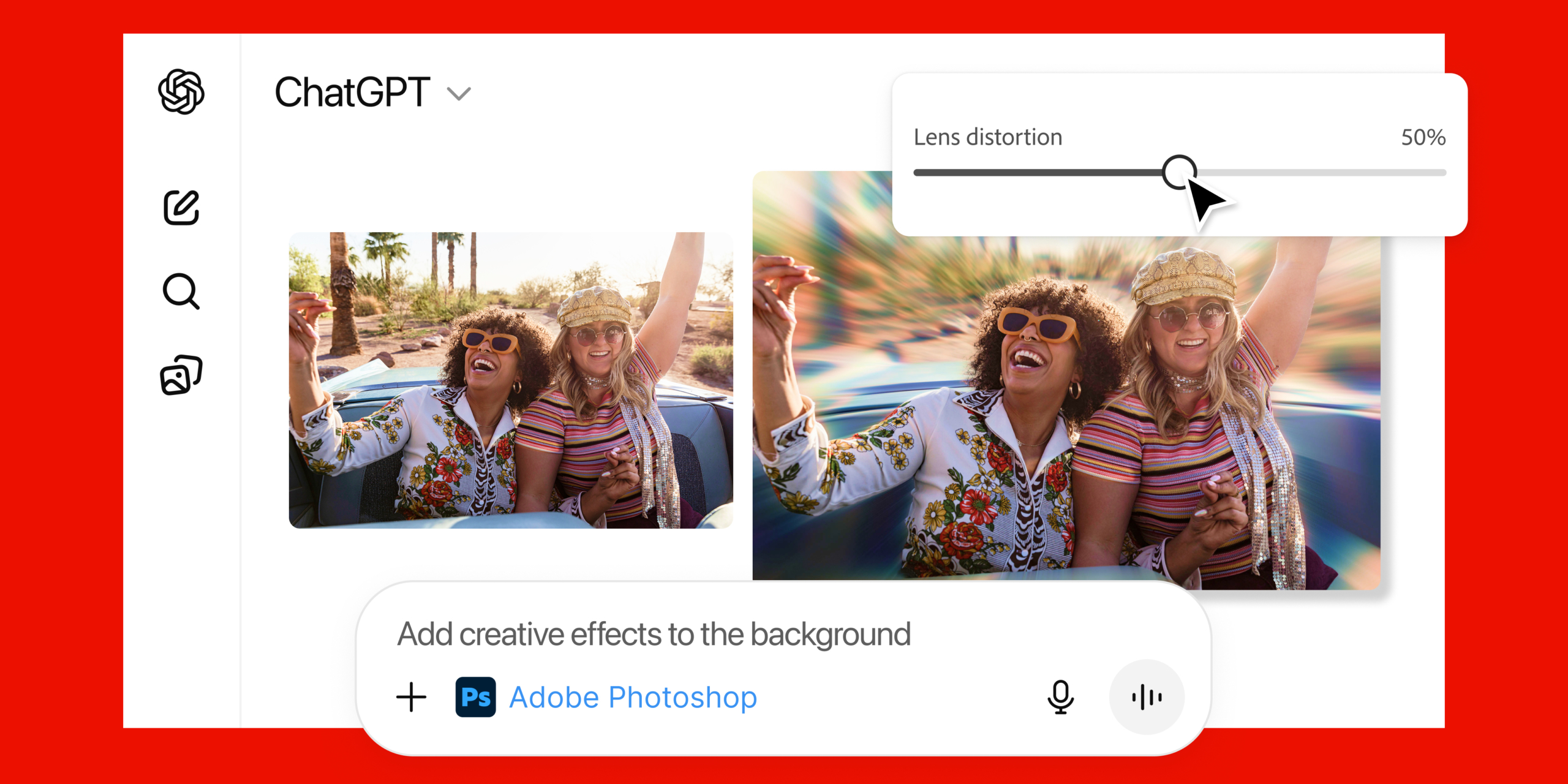 Photoshop внутри ChatGPT позволяет корректировать отдельные участки изображения, применять эффекты и менять параметры вроде яркости, контрастности и экспозиции. Полноценного генеративного расширения тут нет — сервис не дорисовывает отсутствующие области кадра, а лишь создаёт размытый фон по краям. В некоторых случаях нейросеть предоставляет несколько вариантов картинки на выбор или предлагает настроить параметры с помощью ползунков.