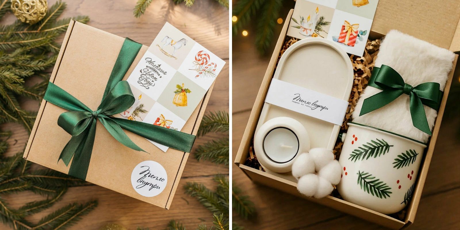 Бренд собирает подарки с душой, поэтому мы не удержались и добавили ещё один набор. В этот раз без шарфа, но с пушистыми тёплыми носками и большой кружкой, расписанной веточками омелы. Без аромасвечи не обошлось, она тоже идёт в комплекте.