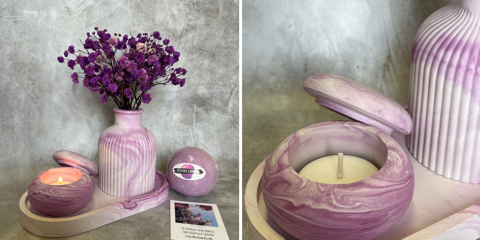 Предметами из подарка легко оформить уютный уголок на журнальном столе или прикроватной тумбе, чтобы сделать атмосферу уютнее при помощи вазы, аромасвечи в массивном подсвечнике и подставки. Для полного расслабления предусмотрена ещё и бомбочка для ванны.