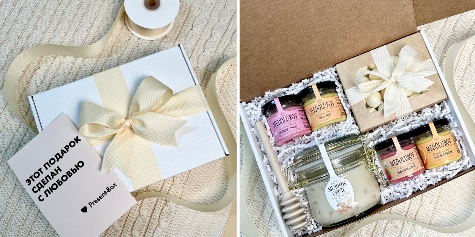 Как утверждает производитель: «подарок сделан с любовью». И это прослеживается во всём, начиная от качественной и красивой упаковки с пышным бантом и заканчивая наполнением. Оно здесь достойно восхищения: вишня в белой глазури, пять видов мёда-суфле и специальная деревянная ложка для него.