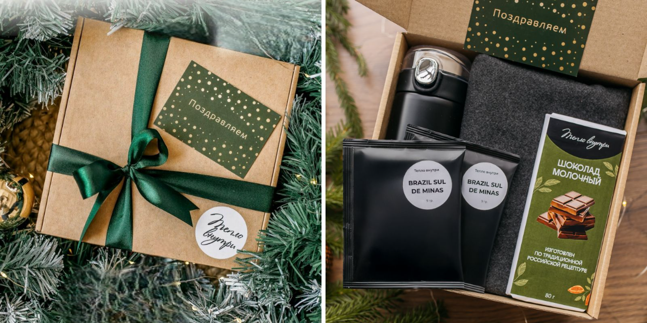 Подарок продуман до мелочей и включает в себя то, что нужно каждый день. Например, тёплый шарф, без которого зимой никуда. Помимо него в комплект входит термокружка и два кофе в дрип-пакетах, чтобы сразу же опробовать презент, и плитка молочного шоколада на десерт.