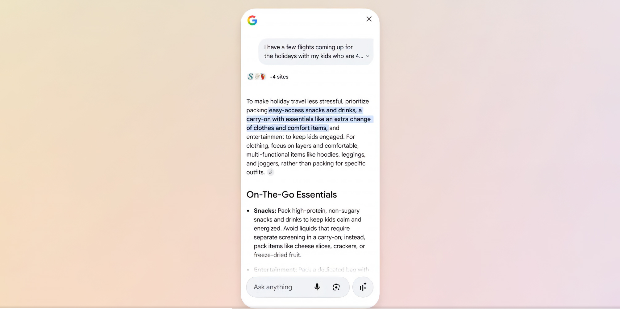 После переключения появляется строка «Спросить что угодно» — она позволяет развивать тему, не покидая страницу результатов. ИИ-режим основан на моделях Gemini 3 и Gemini 2, которые умеют связывать цепочки запросов и давать развёрнутые ответы, дополняя их изображениями и видео, если это уместно.