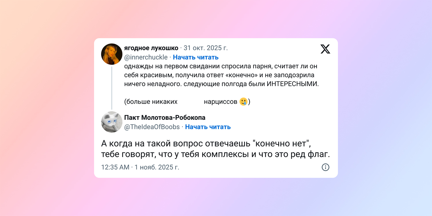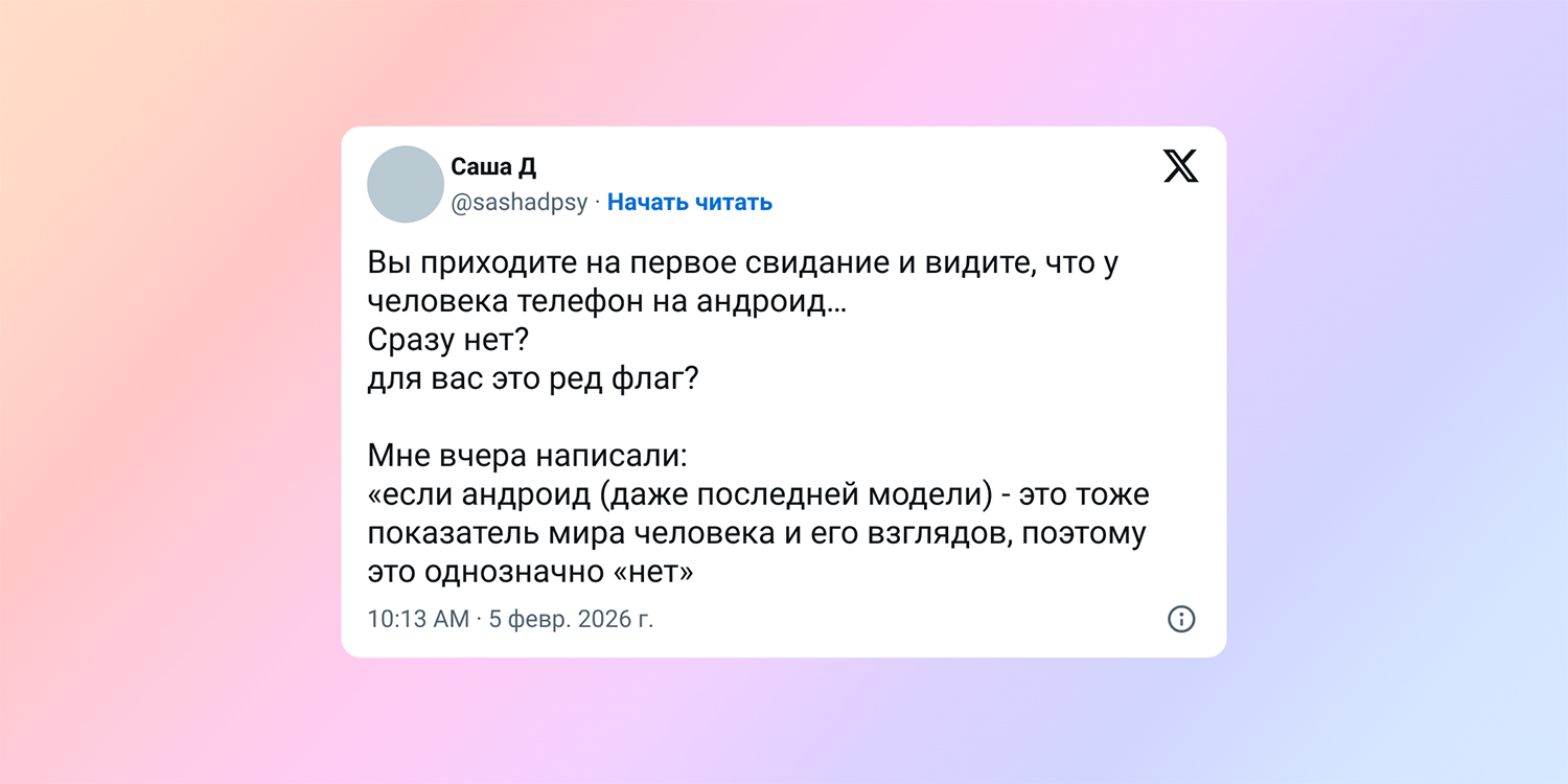 Если человек не получил какого-то определённого образования, у него нет мнения относительно политического устройства Венесуэлы, он выберет спасти из пожара свою собаку, а не чужого ребёнка — это не красные флаги. Это маркеры, которые указывают на то, что у вас с человеком разные цели в жизни, противоположные моральные воззрения и так далее.