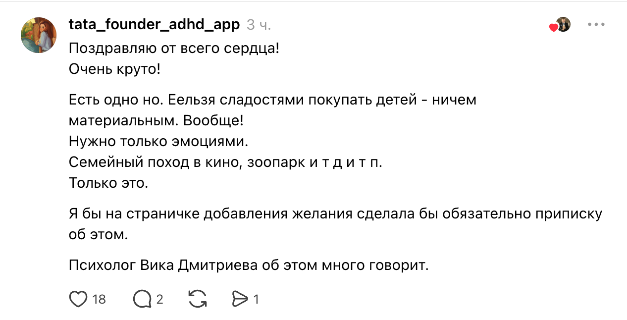 Пользователи уже делятся лайфхаками. Например, одна мама предложила отказаться от сладостей в качестве награды и делать упор на впечатления — походы в кино, зоопарк или цирк.