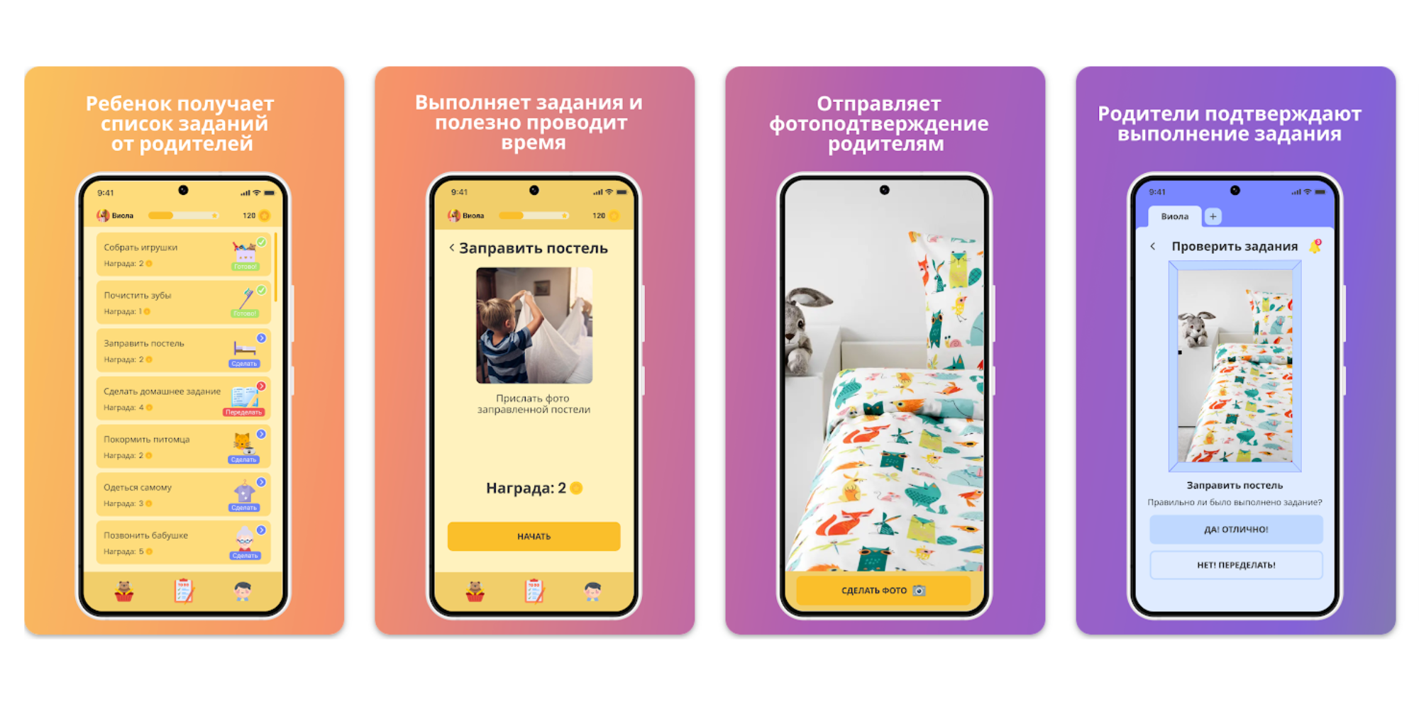 Принцип простой: родитель задаёт список дел, ребёнок выполняет их, отправляет фотоотчёт и копит монеты на заранее выбранные призы. В список можно добавить что угодно — от уборки игрушек и чистки зубов до домашнего задания и помощи по дому.