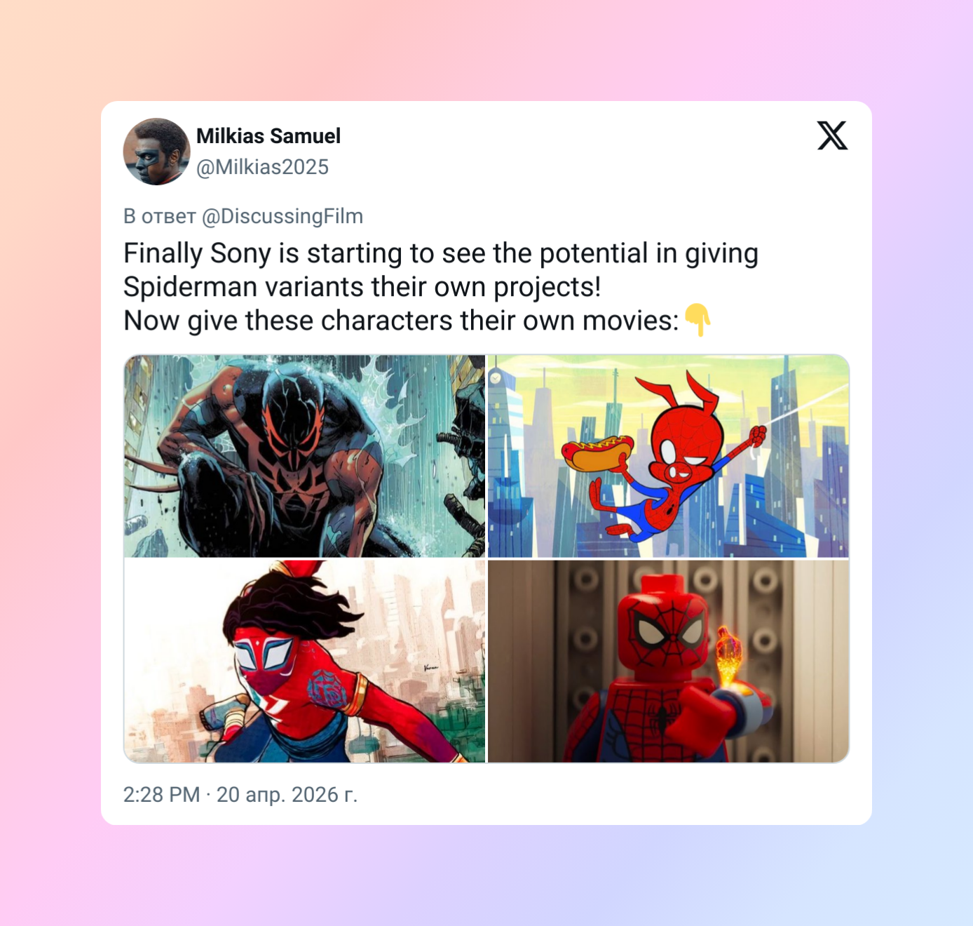 Наконец-то Sony увидела потенциал в том, чтобы дать разным вариантам Человека-паука собственные проекты. А теперь подарите этим персонажам собственные фильмы.