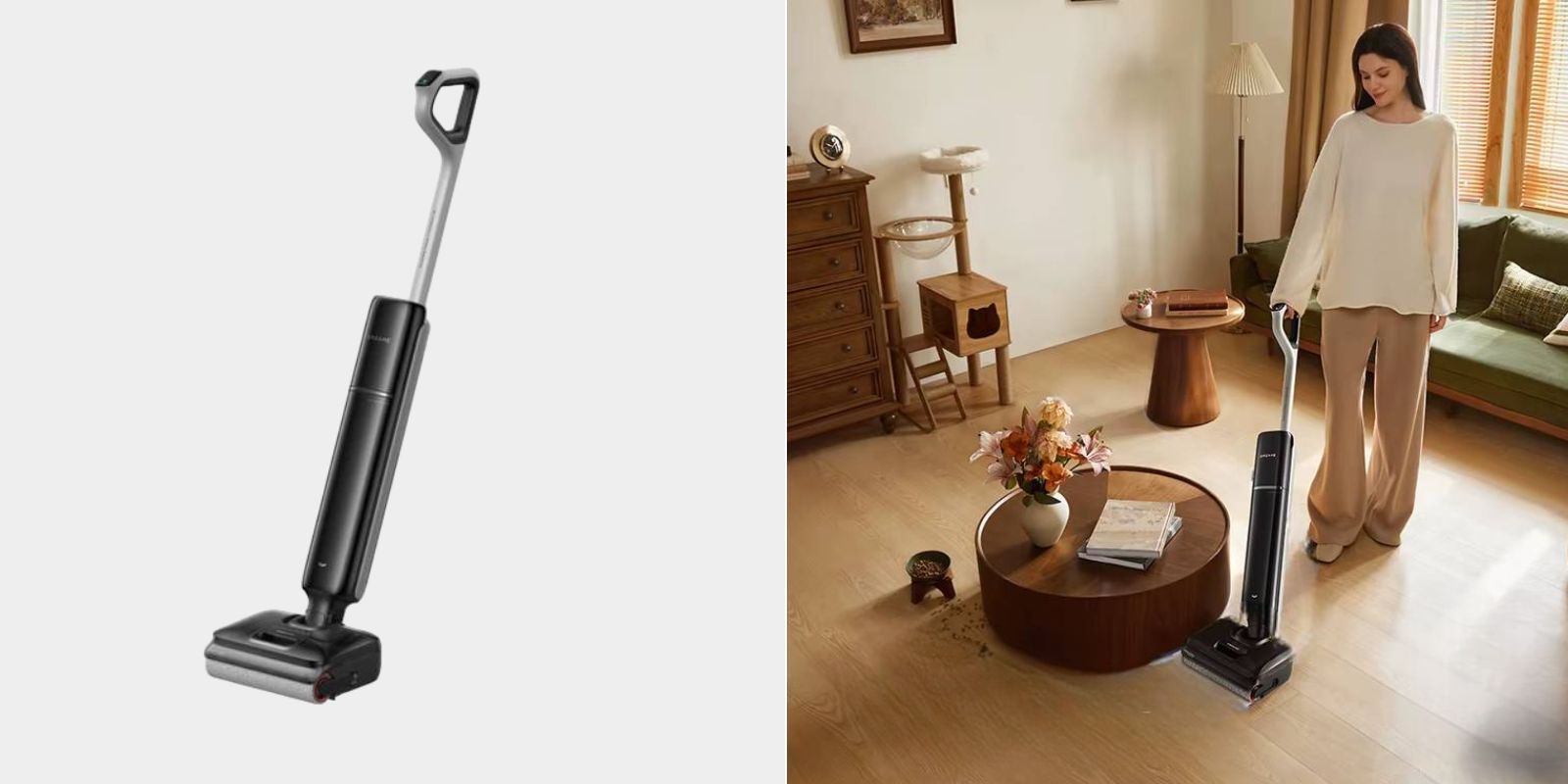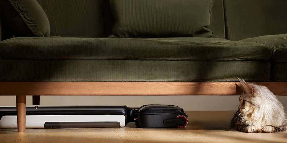 Эта новинка от Dreame убирает сухой мусор и моет пол, а чистая вода при этом не смешивается с грязной, потому что находится в отдельной ёмкости. Во время уборки волосы не наматываются на щётку из-за особой двойной конструкции и специального скребка. Пылесосом удобно убирать на открытых участках и под мебелью — он раскладывается на 180 градусов.