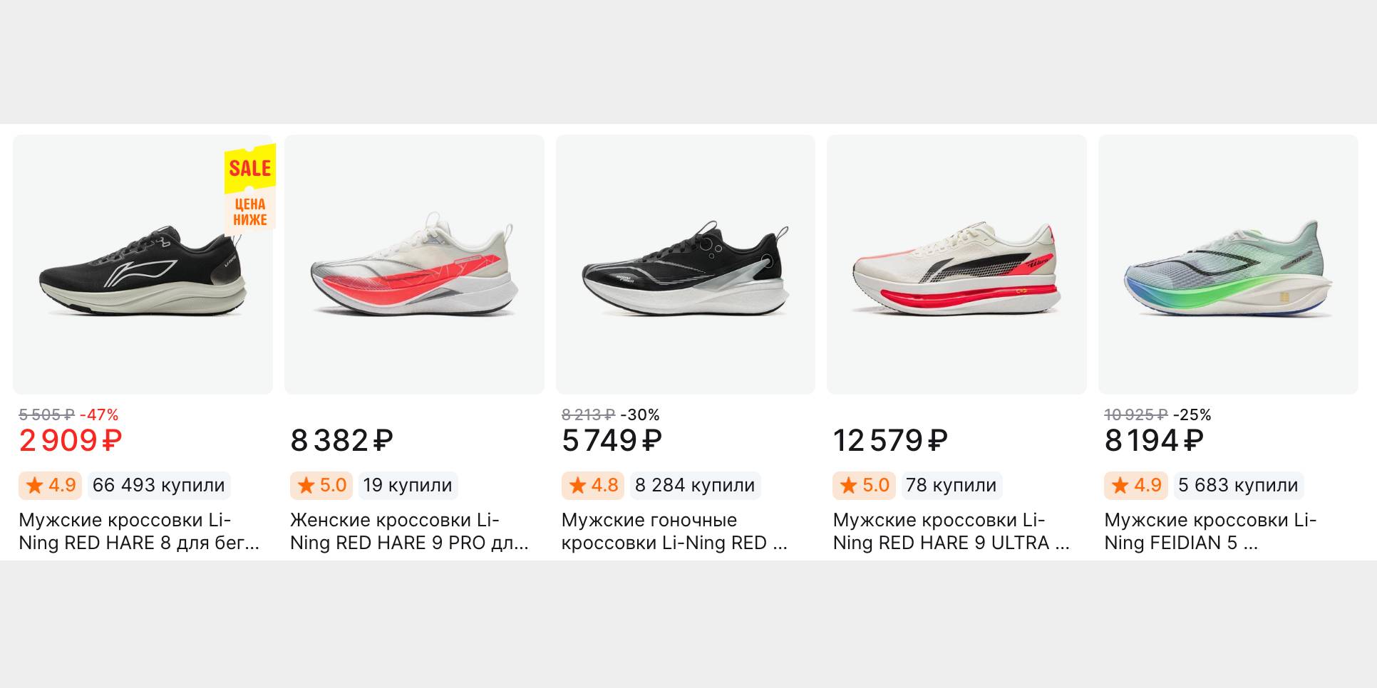 В магазине LINING Store можно купить кроссовки на каждый день и для занятий определёнными видами спорта, а ещё — шлёпанцы, ведь зима когда-то закончится.