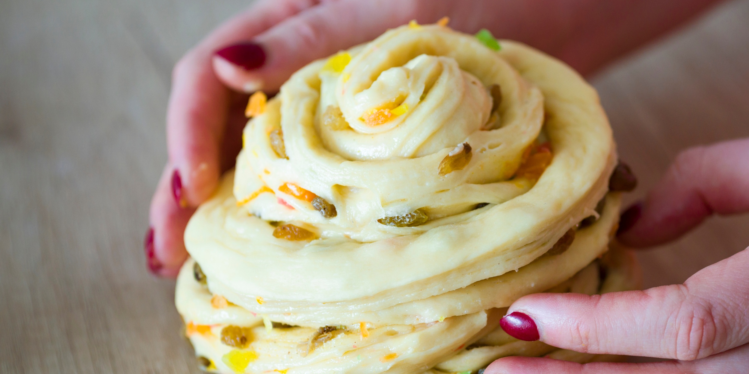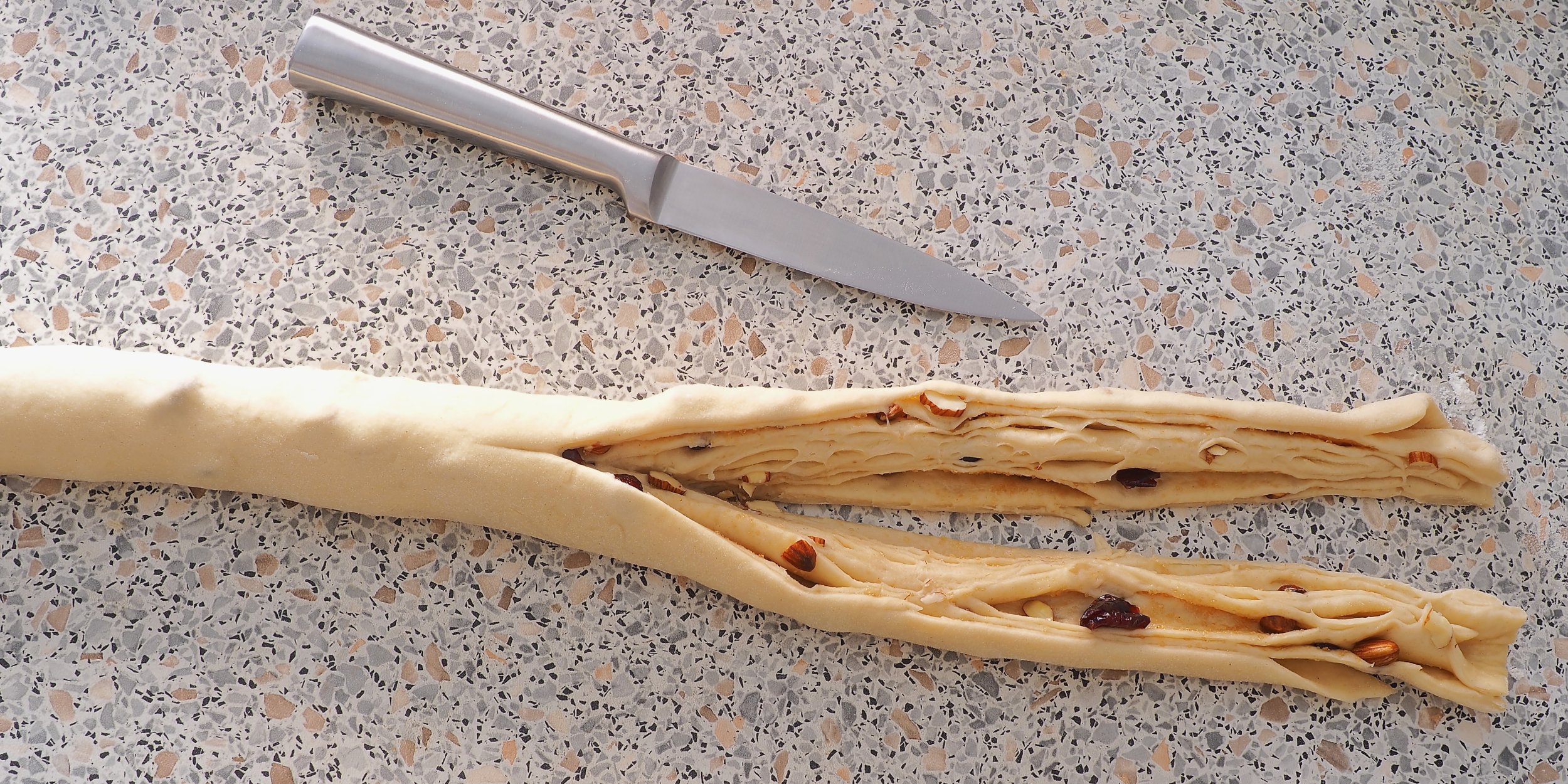 Сверните тесто в длинный рулет и разрежьте его вдоль пополам, не доходя до конца около 2–3 см.
