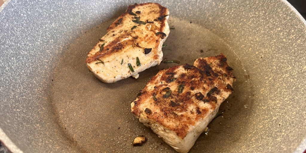 Разогрейте сковороду на среднем огне. Выложите стейки на сухую поверхность и жарьте 3–4 минуты до румяной корочки.