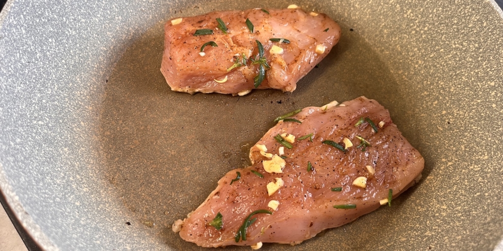 Я люблю добавлять к мясу свежий розмарин, но вы можете взять и другую ароматную зелень, например тимьян. То же самое касается и специй — выбирайте их по своему вкусу, регулируя остроту и пряность блюда. Если у вас есть сковорода-гриль — чудесно. Но можно вполне обойтись и обычной.
