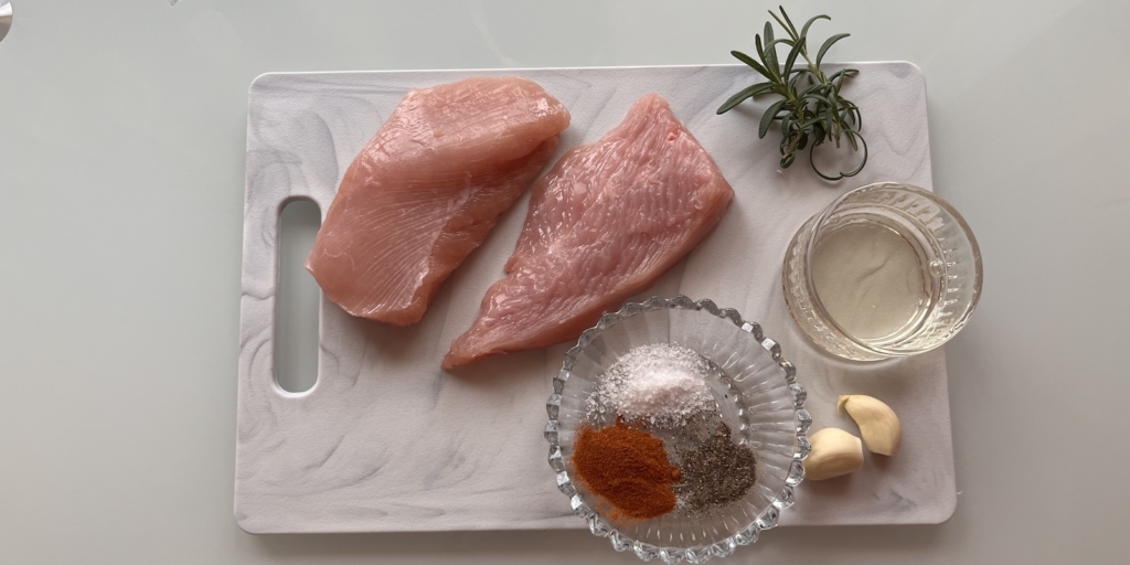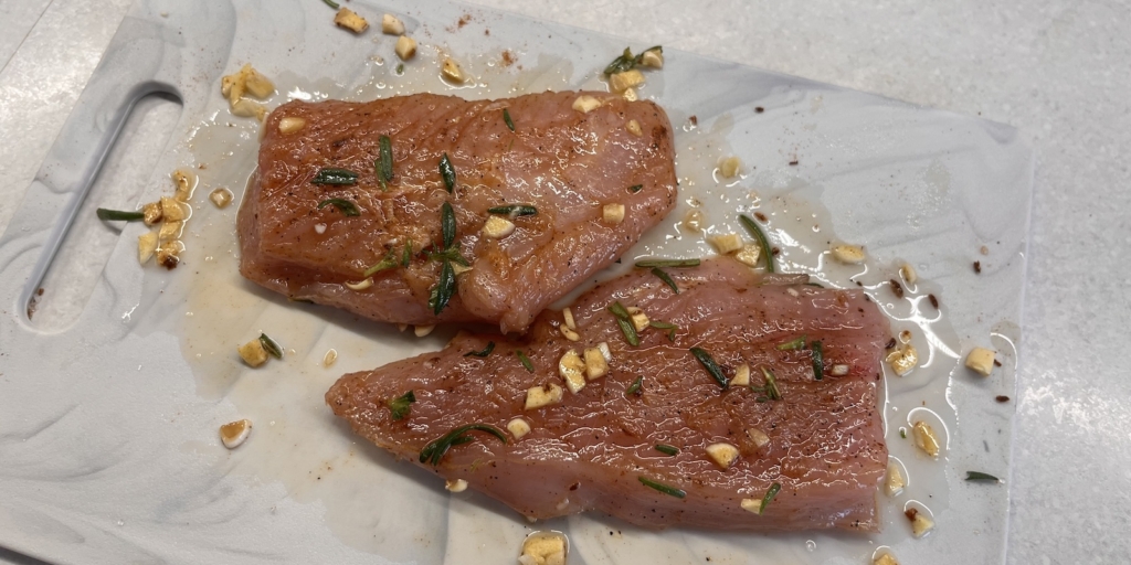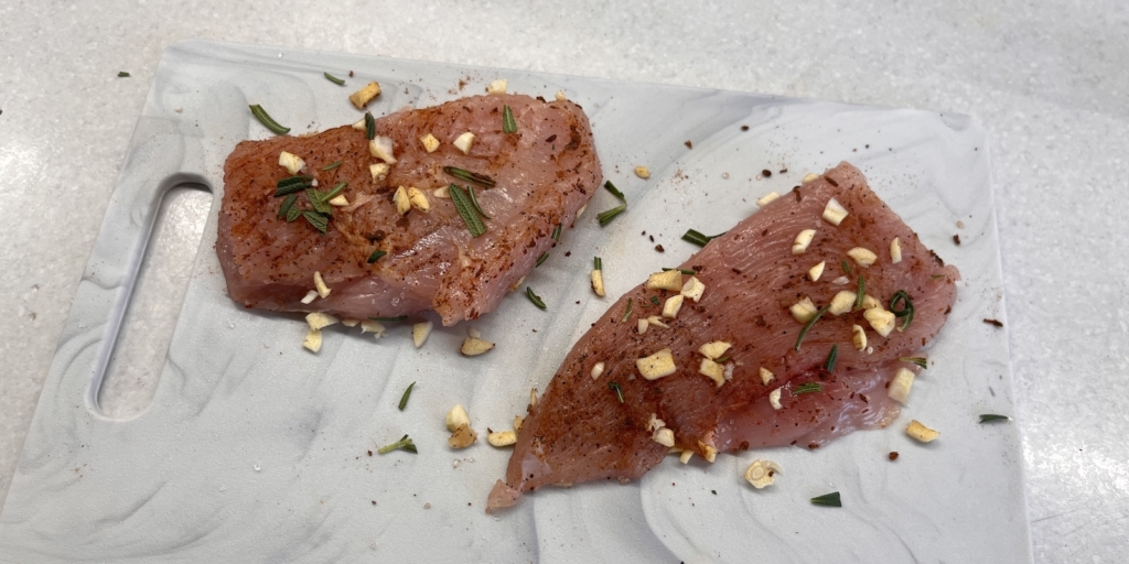 Подготовьте все ингредиенты. Индейку по возможности лучше достать из холодильника заранее, чтобы она нагрелась до комнатной температуры. Толщина стейка должна быть около 1,5–2 см. У меня было 2 куска филе, но можно, конечно, взять и один большой.