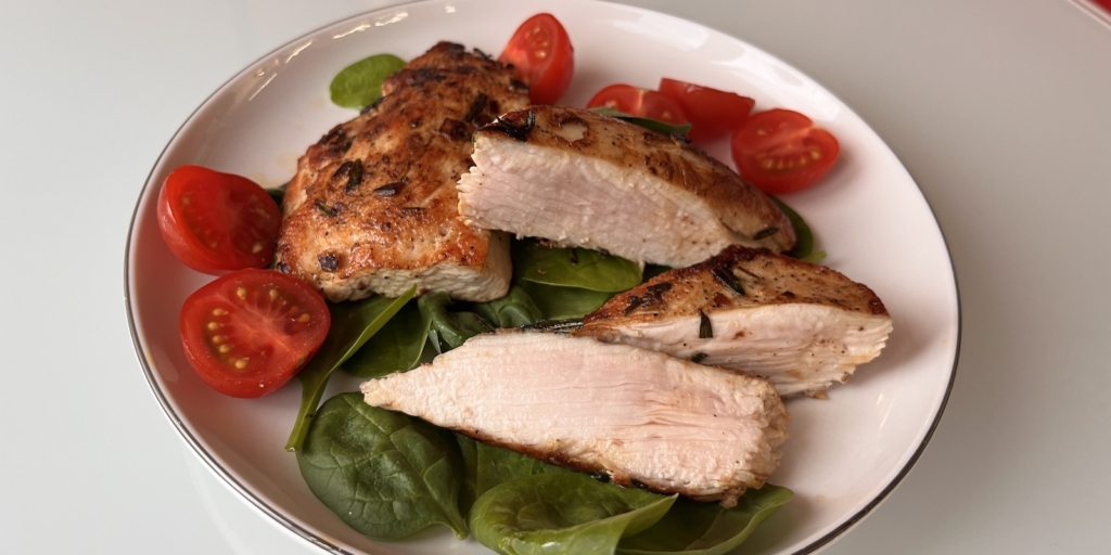 Подавайте стейки из индейки с любым гарниром по вкусу. Я люблю сочетать мясо с чем-то лёгким, поэтому дополнила блюдо шпинатом и помидорами черри.