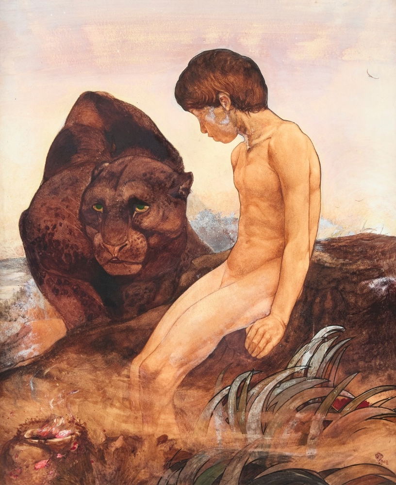 Речь идёт об иллюстрациях, созданных в 1903 году для роскошного портфолио 16 Illustrations of Subjects from Kipling’s The Jungle Book («16 иллюстраций к сюжетам из „Книги джунглей“ Киплинга»), заказанного издательством Macmillan. Тираж составил всего 500 экземпляров, и издание вышло отдельно от самой книги, впервые опубликованной в 1894 году.