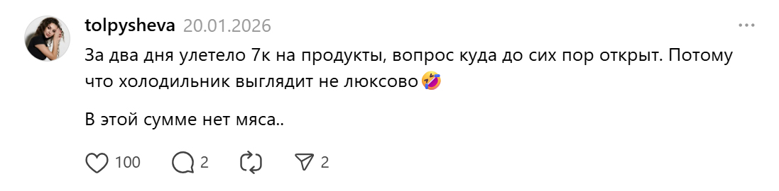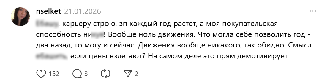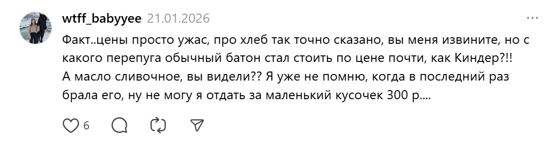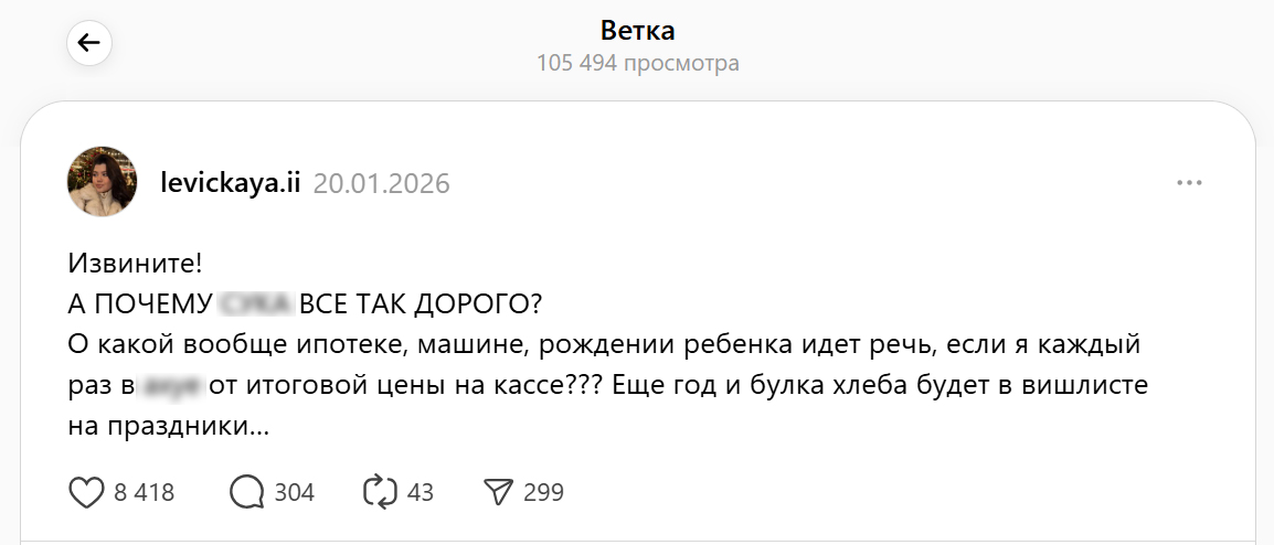 Многие в России уже привыкли к высокой инфляции, неподъёмной ипотеке и постоянному росту тарифов. Но начавшийся 2026 год с резким подорожанием буквально всего вокруг, похоже, стал точкой, где запас терпения начал заканчиваться. В соцсетях всё чаще появляются гневные публикации о том, как дорожают даже базовые продукты, и по комментариям видно, что это замечает всё больше людей.