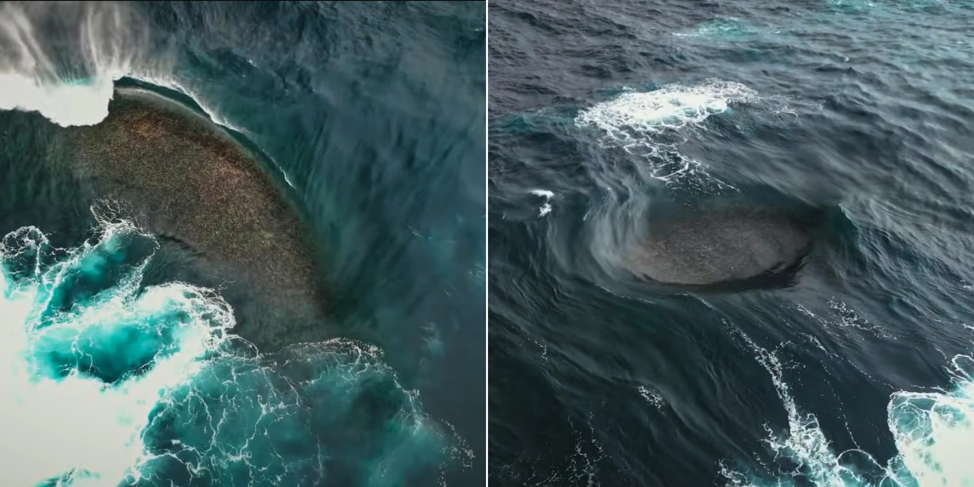 Австралийские бодибордисты во время съёмок любительского фильма редкое природное явление — место, где сразу четыре волны сходятся в одной точке в океане, а затем вместе выстреливают как пушка. Выглядит это так, словно взорвалась глубоководная бомба.