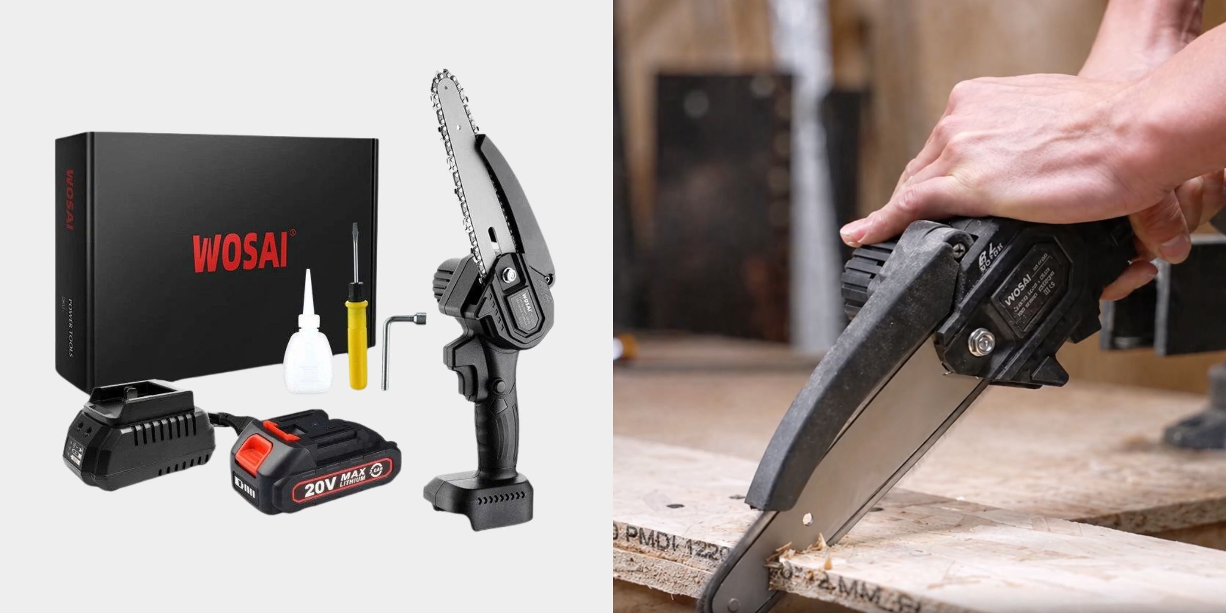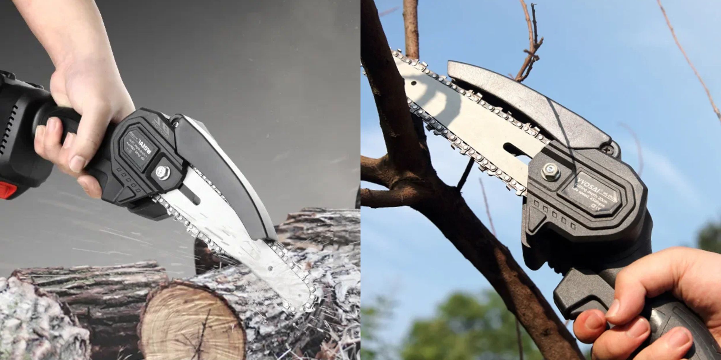 Модель от Wosai с 6‑дюймовой шиной (около 15 см рабочей длины) питается от аккумулятора 20 В — этого хватает для бытовых задач вроде обрезки веток и распила небольших брёвен. Подходит для дачи, ухода за садом и несложных строительных работ, где важны мобильность и манёвренность.