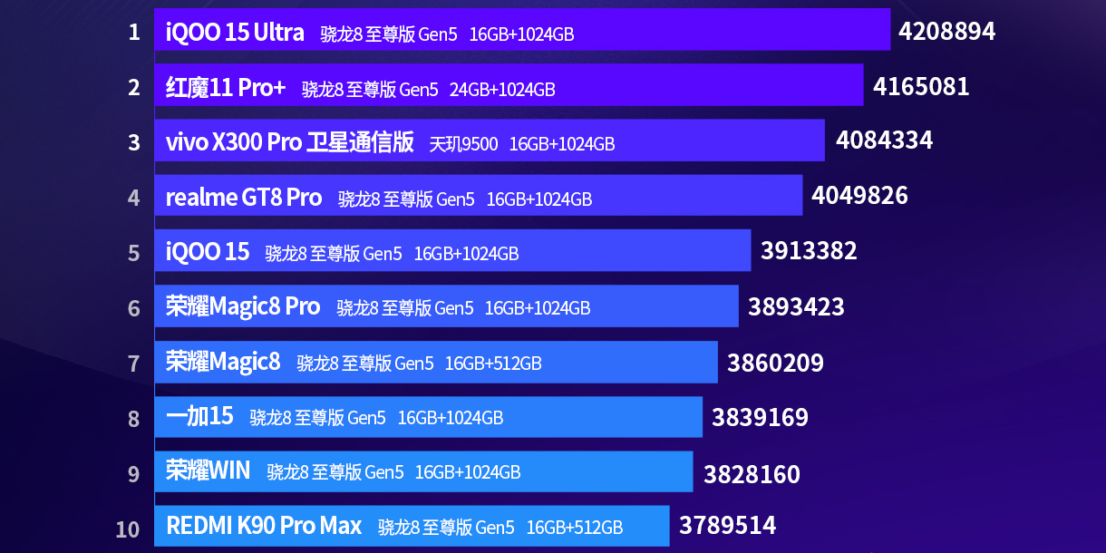 Самым производительным Android‑смартфоном месяца признали iQOO 15 Ultra. Устройство на базе Snapdragon 8 Elite Gen 5 набрало в среднем 4 208 894 балла. Это первая модель серии с приставкой Ultra, и компания сделала ставку именно на максимальную производительность.