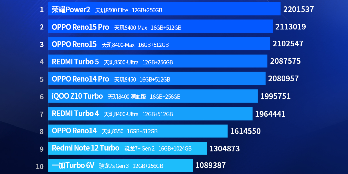 В рейтинг также вошли Redmi Turbo 5 (2 087 575), Oppo Reno 14 Pro (2 080 957), iQOO Z10 Turbo (1 995 751), Redmi Turbo 4 (1 964 441) и Oppo Reno 14 (1 614 550). Два последних места заняли модели на чипах Qualcomm: Redmi Note 12 Turbo (1 304 873) и OnePlus Turbo 6V (1 089 387).