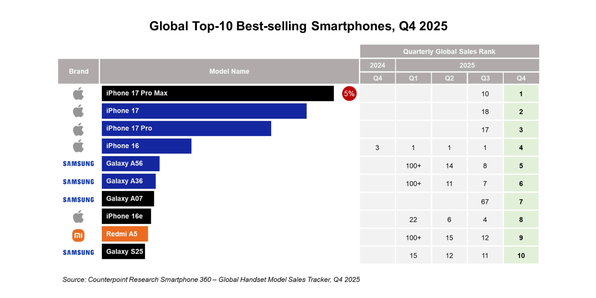 Самым популярным смартфоном квартала стал iPhone 17 Pro Max. Далее идут iPhone 17, iPhone 17 Pro и iPhone 16. Среди Android‑устройств лучше всего продавались Galaxy A56, Galaxy A36 и Galaxy A07.