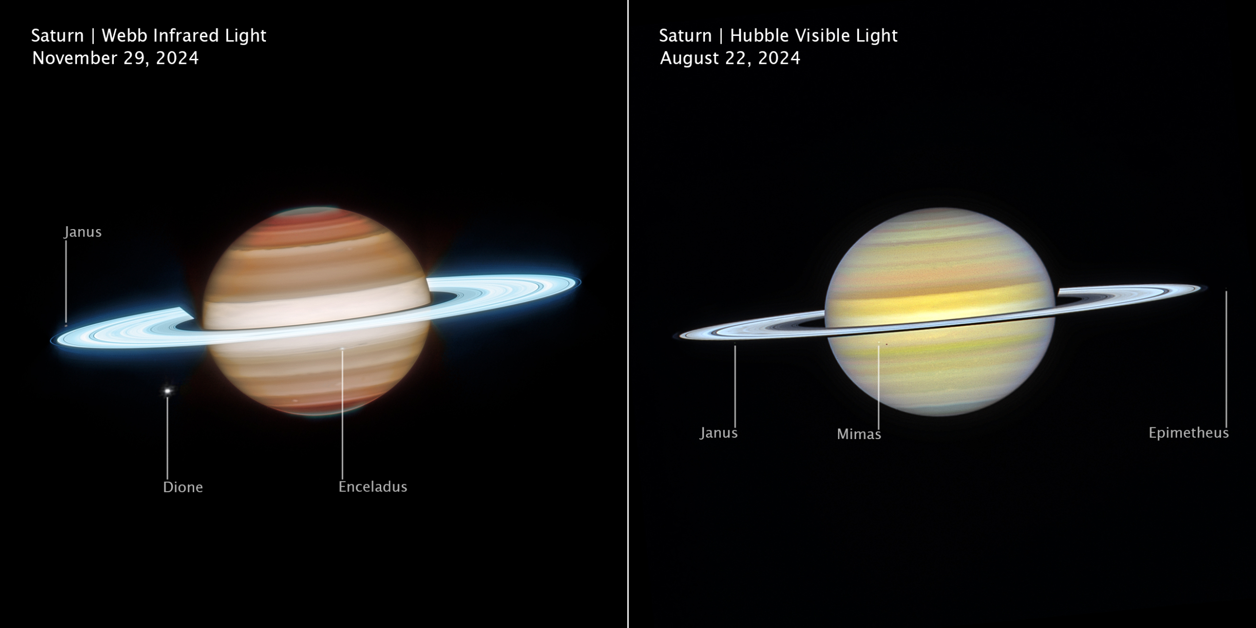На инфракрасных снимках Сатурн выглядит более контрастным: полосы стали насыщеннее, полюса приобрели серо-зелёный оттенок, а кольца засветились ярким белым цветом. В видимом свете планета выглядит мягче — с бледно-жёлтыми полосами и лёгким голубым оттенком у полюсов.