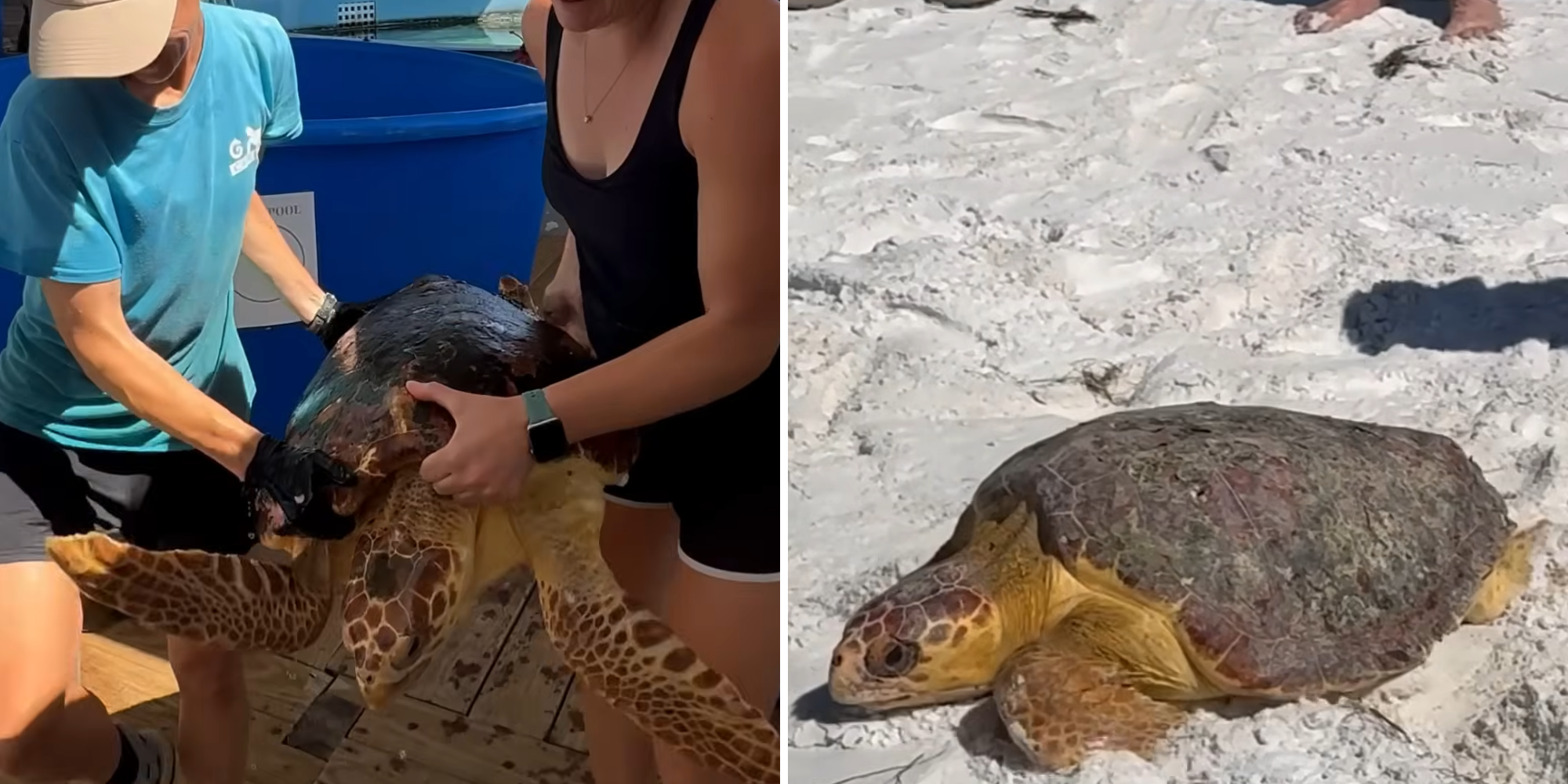 В прошлом году морской биолог Табита Зигфрид из центра Gulfarium CARE Center (США) в Мексиканском заливе морскую черепаху, которая едва могла двигаться. Не раздумывая, она прыгнула в воду и вытащила животное на берег. Всё его тело было покрыто сотнями ракушек, мешавших передвигаться.