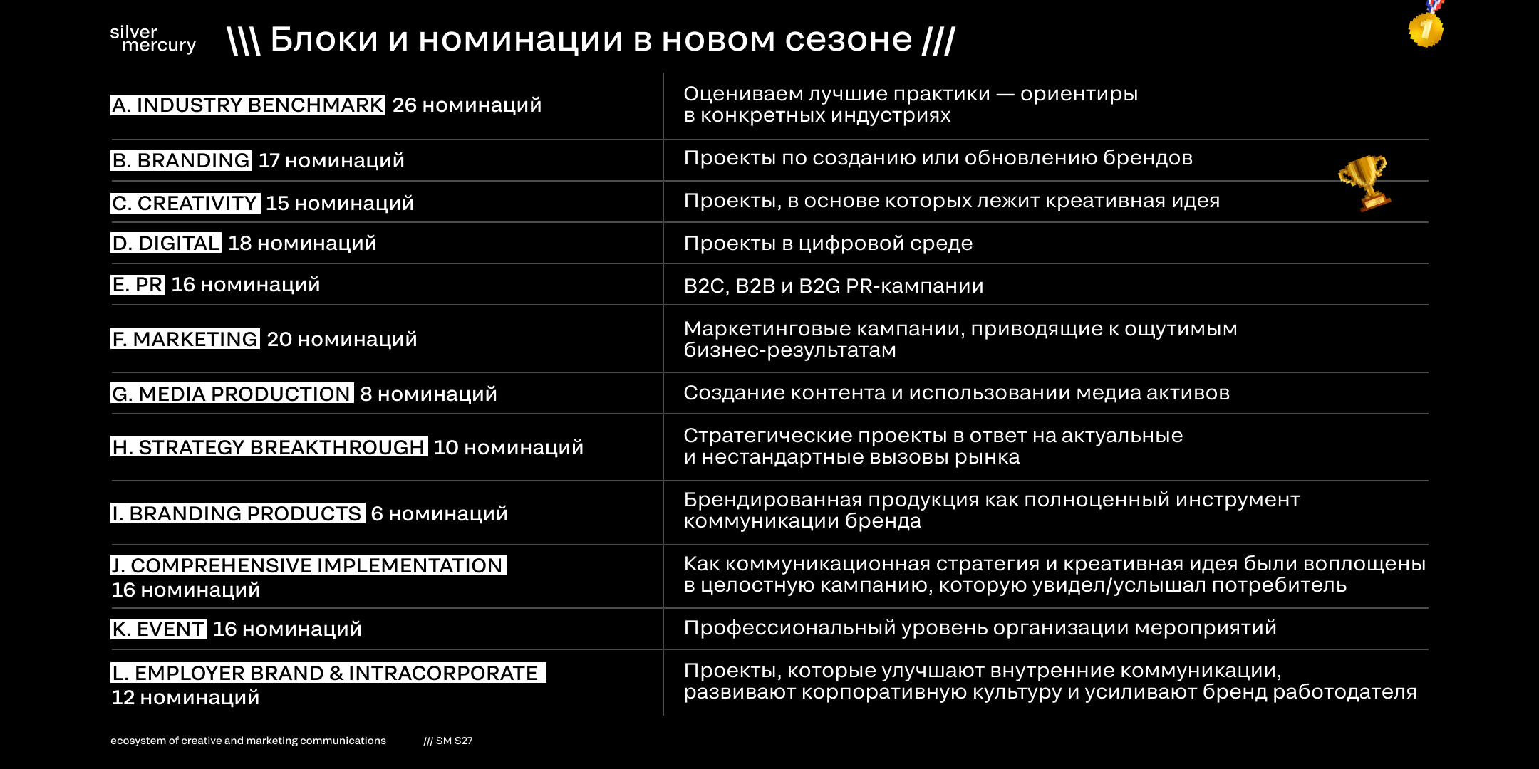 В этом году премия включает 180 номинаций, из них 23 новые. Чтобы повысить качество проектов, SM Awards запускает комплексную программу подготовки номинантов. Она включает персональное сопровождение участников, обучающие вебинары и проект «Прожарка». Кроме того, полностью обновили форму подачи, чтобы заявка выглядела как цельная и убедительная история.