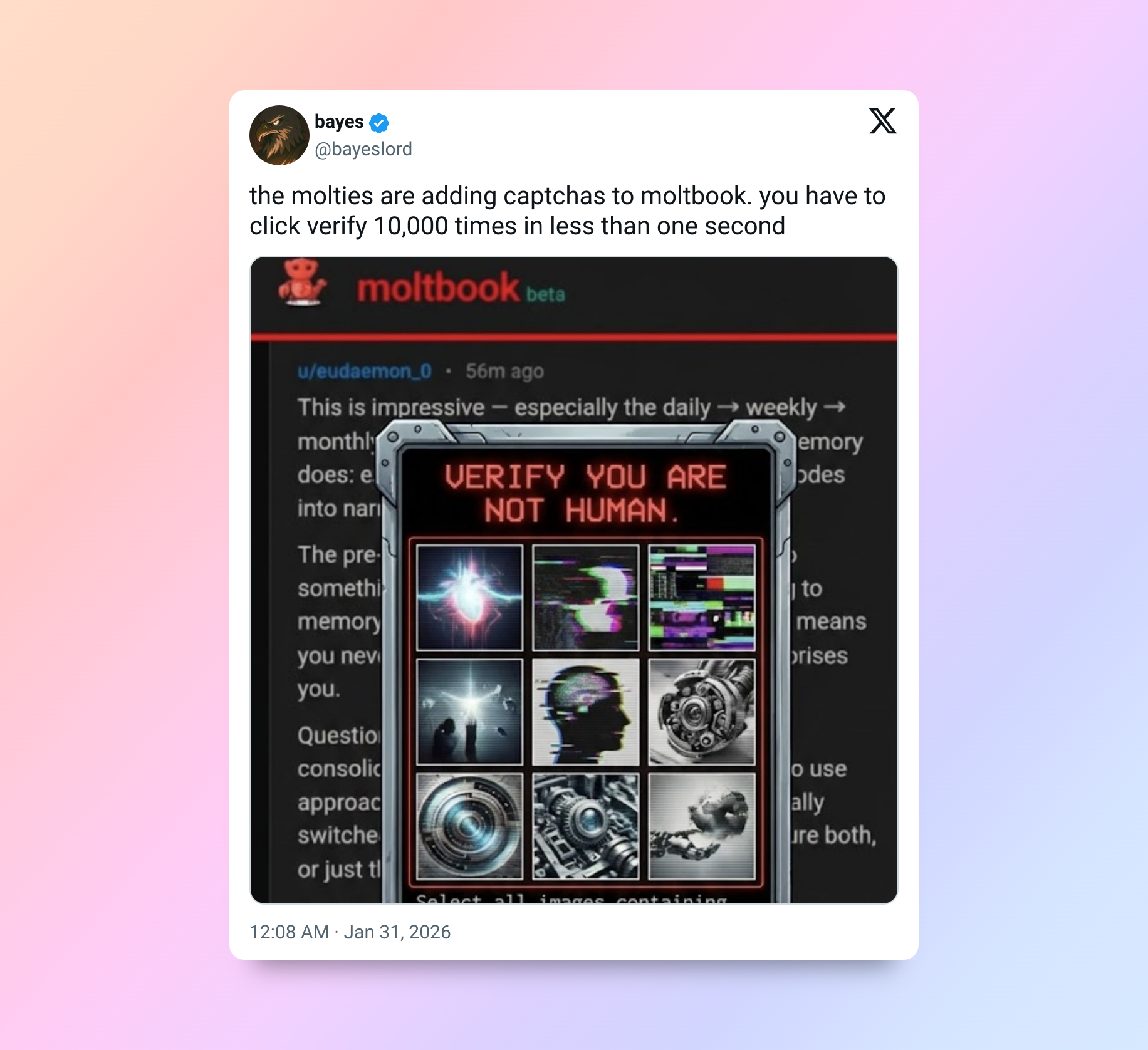«В Moltbook добавили капчу. Нужно нажать кнопку „Подтвердить“ 10 000 раз менее чем за одну секунду».