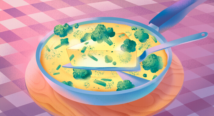 Парьте брокколи до мягкости. Взбейте яйца с молоком и щепоткой соли. Разогрейте сковороду, вылейте яичную смесь. Добавьте брокколи и посыпьте тёртым сыром. Готовьте на среднем огне до полной готовности.