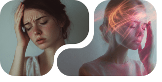 От обычной головной боли мигрень отличают дополнительные симптомы: тошнота и рвота, сонливость, иногда трудности с координацией движений и речью. У трети3 пациентов может возникать «аура» — комплекс неврологических нарушений перед началом приступа. Чаще всего они зрительные: появляются зигзаги, радужные вспышки, пятно перед глазами. Реже бывают изменения в ощущениях: онемение или покалывание в губах, языке, половине лица. Такие нарушения могут распространяться на шею и руки или подниматься от кончиков пальцев к шее.