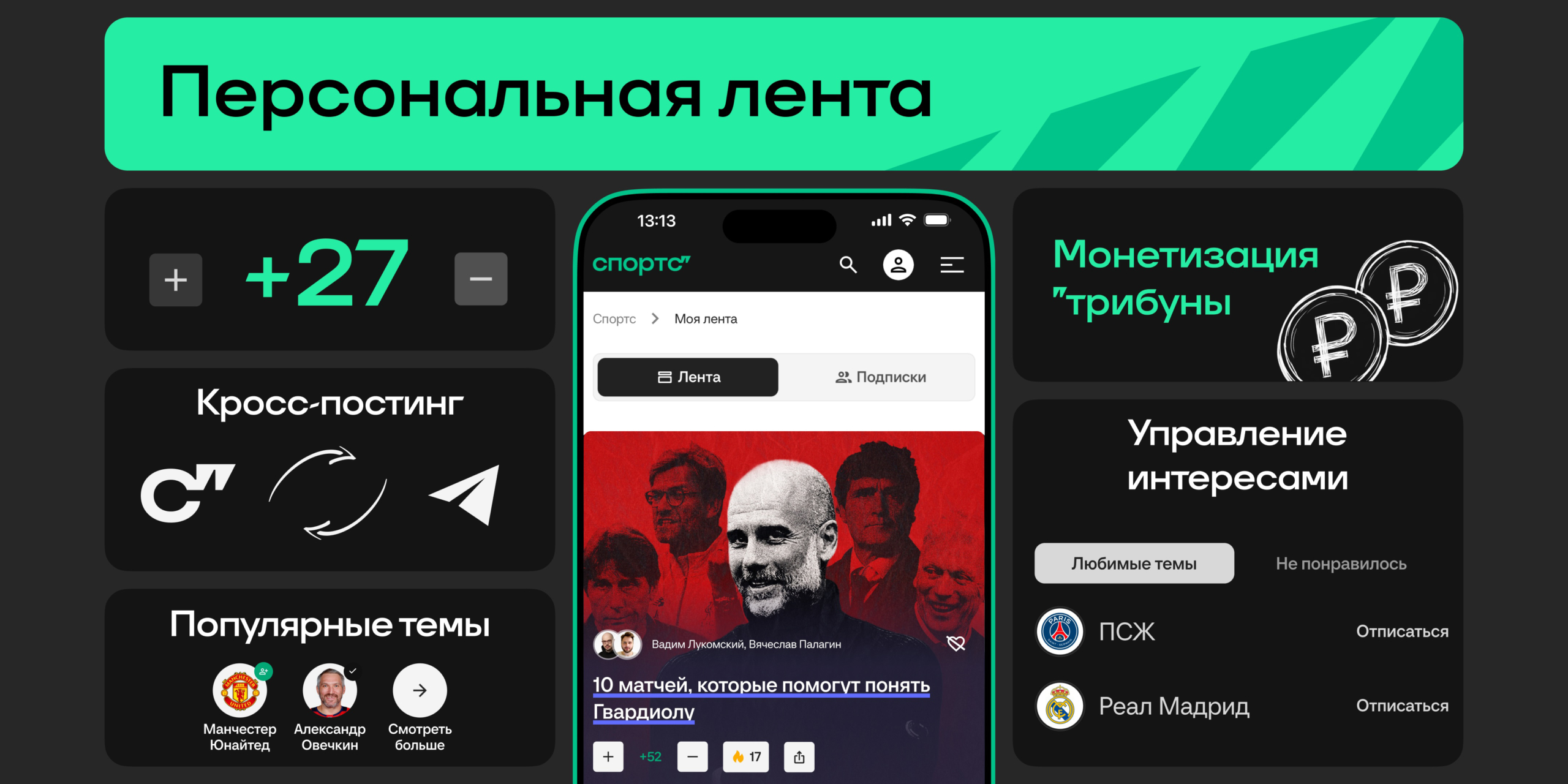 Главное нововведение — раздел «Моя лента». Теперь материалы на сайте формируются под интересы каждого читателя: алгоритмы объединяют редакционные статьи, публикации из блог-платформы «Трибуна» и ключевые новости дня. Пользователи могут настраивать рекомендации, подписываться на команды и авторов, скрывать нежелательные темы и удалять повторяющиеся посты.