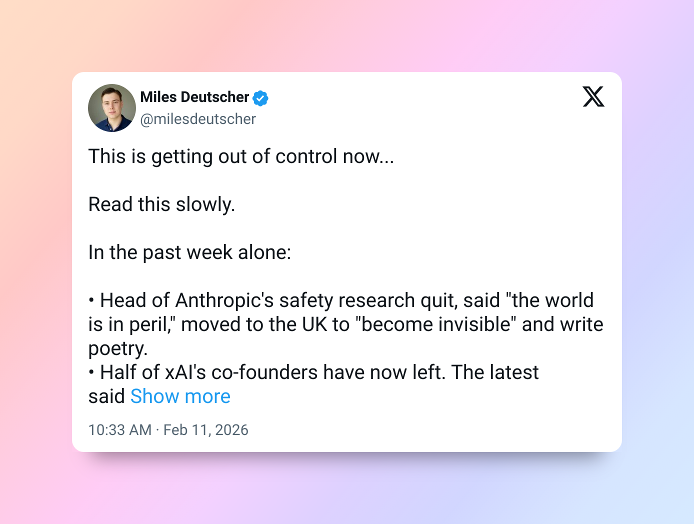 - Глава отдела исследований безопасности компании Anthropic , заявив, что «мир в опасности», и переехал в Великобританию, чтобы «стать незаметным» и писать стихи.