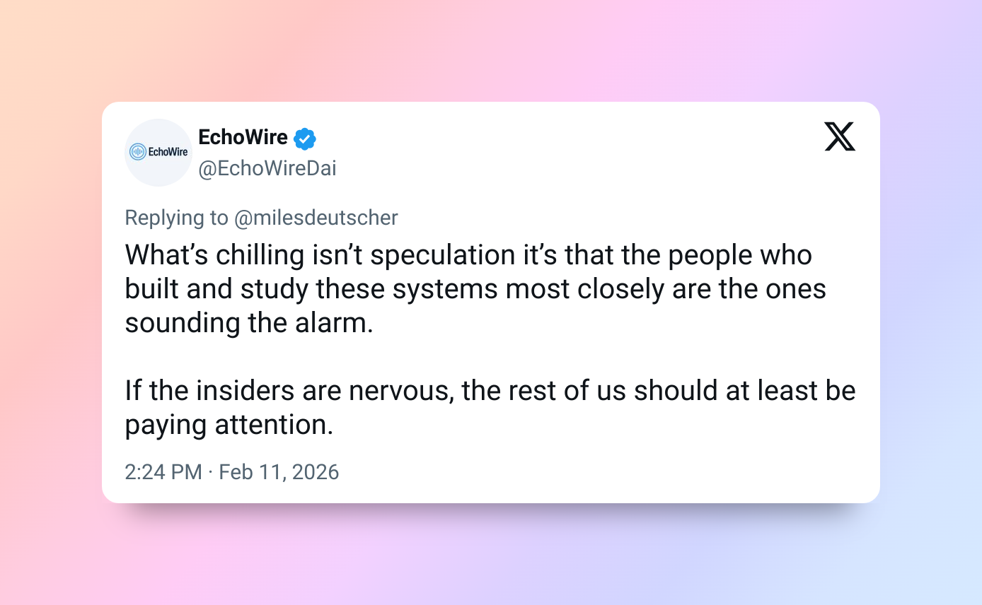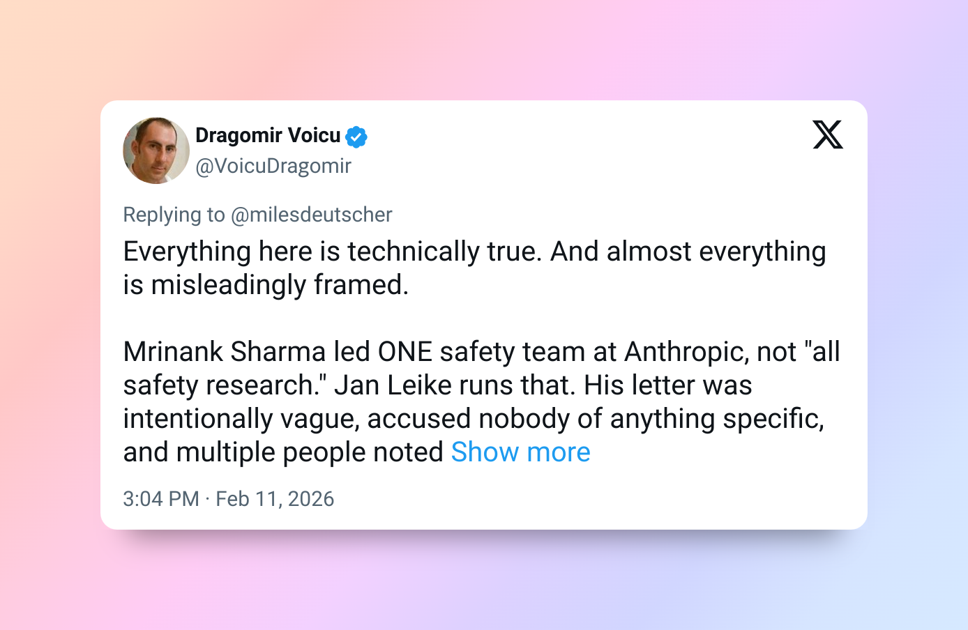 Автор самого популярного комментария (две тысячи лайков) раскритиковал информацию за излишнюю драматичность. Он согласился с фактами, но считает, что они преподнесены так, чтобы вводить в заблуждение. Так, Мринанк Шарма, о котором идёт речь в первом пункте, возглавлял лишь одну группу по безопасности, а информация о способности Claude распознавать тестирование появилась ещё осенью 2025 года.