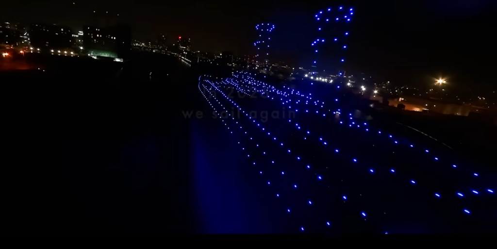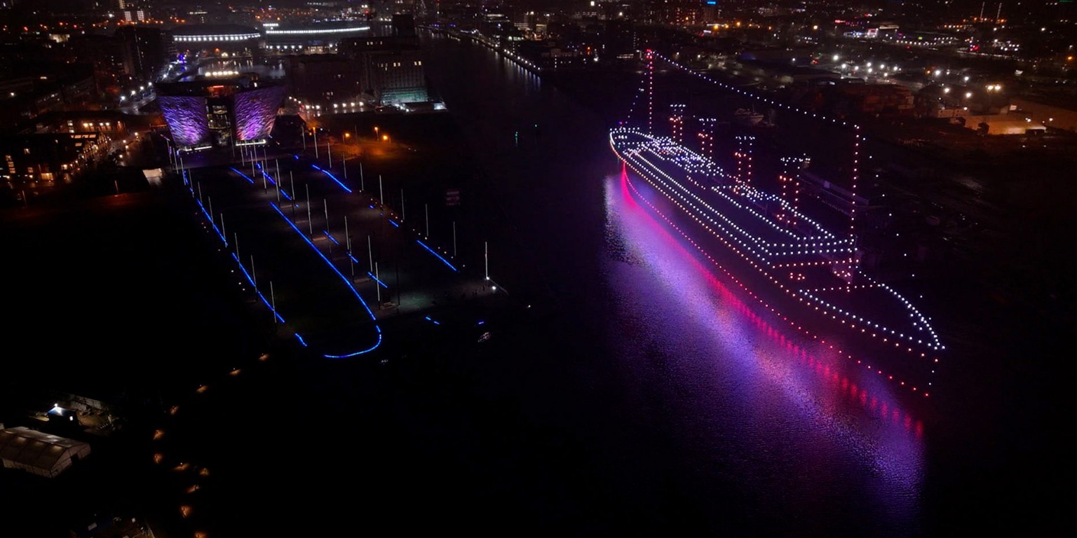 На днях над гаванью Белфаста в Северной Ирландии красочное шоу с участием 950 дронов. Их выстроили в огромный силуэт легендарного «Титаника», точно повторив его очертания, включая дымовые трубы и мачты.