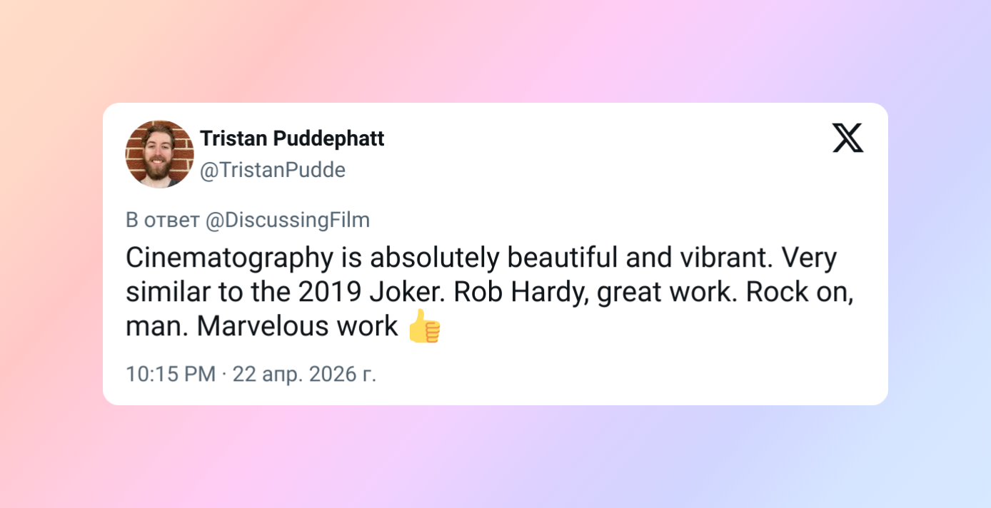 Абсолютно прекрасная и яркая операторская работа. Очень похоже на «Джокера» 2019 года. Отличная работа, Роб Харди. Качай дальше, чувак. Великолепная работа.
