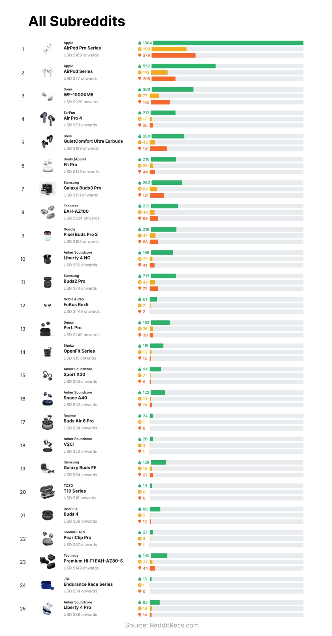 Пользователь под ником heyyyjoo тысячи пользовательских рекомендаций по беспроводным наушникам, опубликованных на Reddit за период с ноября 2024-го по ноябрь 2025 года. Чтобы визуализировать результаты, он свёл данные в две таблицы — одну для профильного сабреддита r/Earbuds и вторую для всех сабреддитов. Так можно наглядно сравнить, какие модели получают больше всего положительных или отрицательных отзывов.