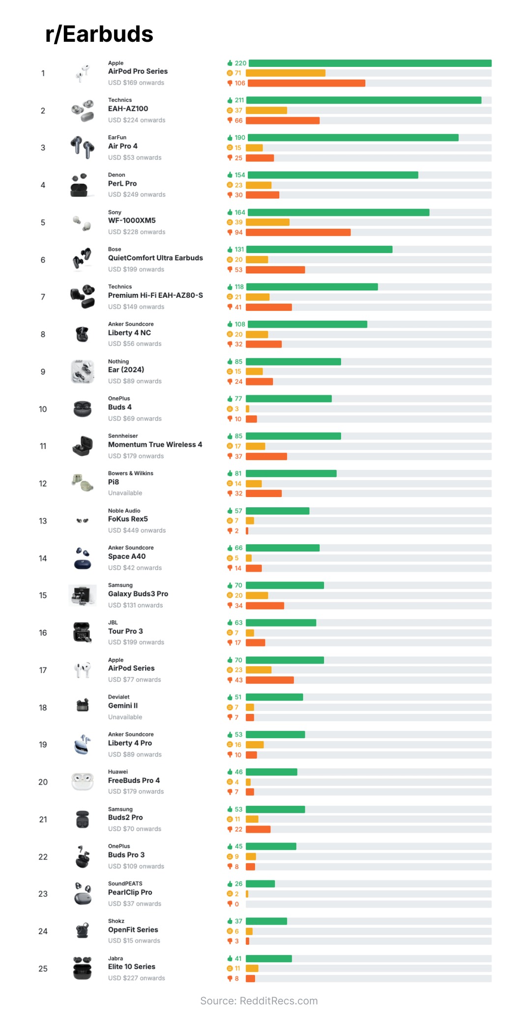 Чаще всего в постах со всех сабреддитов упоминались AirPods Pro. На втором месте оказались обычные AirPods. Также в рейтинге присутствуют Sony WF‑1000XM5, Soundcore Liberty 4 NC и флагманская модель от Bose — QuietComfort Ultra. Ситуация с профильным сабреддитом другая: например, на втором месте там значатся Technics EAH-AZ100, а на четвёртом — Denon PerL Pro.